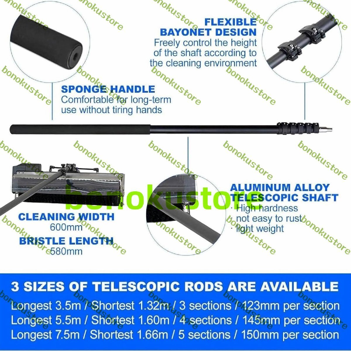 仕様:伸縮ポールはアルミニウム合金製で、3.5m、5.5m、7.5mの3つの長さからお選びいただけます。ブラシヘッドはナイロン製です。清掃幅:60cm