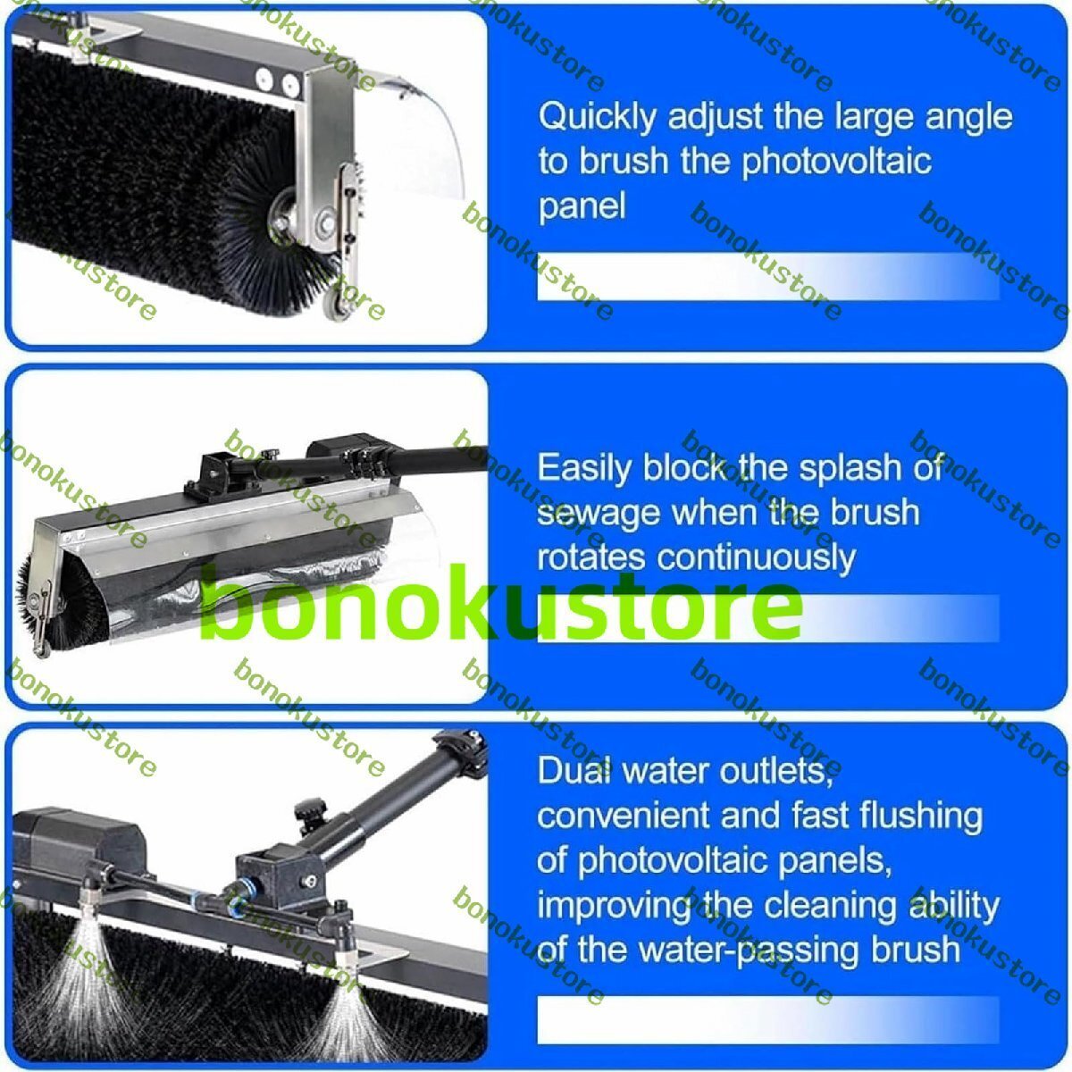 電動太陽光発電パネル洗浄ブラシ、ソーラーパネル洗浄キット、水スプレー設計、角度調節可能、節水設計、山、魚の池、屋上用洗浄装置
