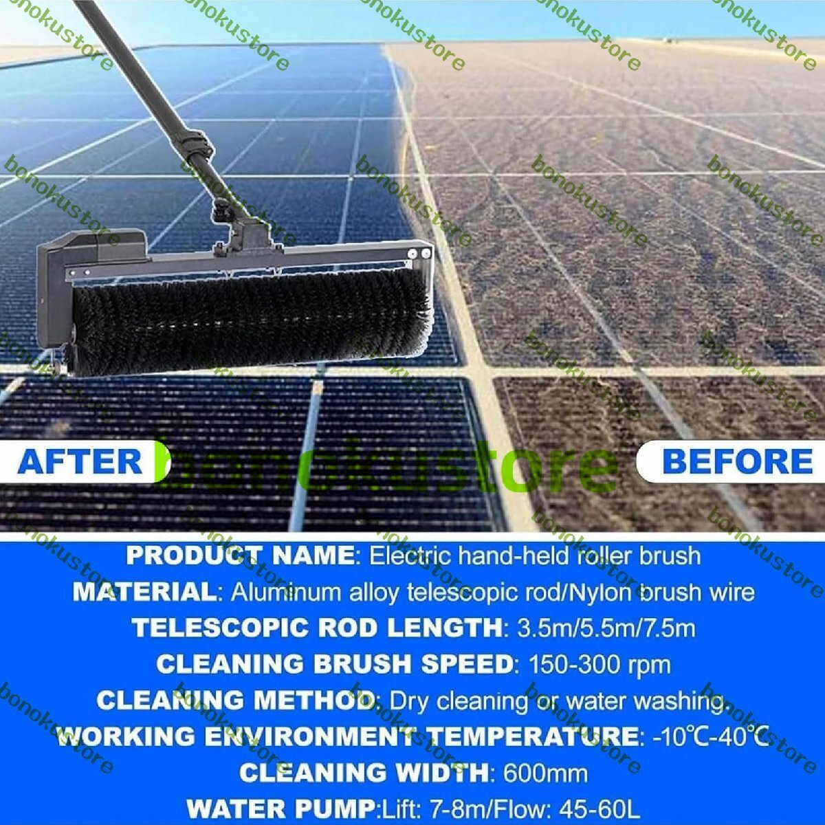 名称:ソーラーパネル用電動回転ブラシ 材質:アルミ合金伸縮ポール/ナイロンブラシ ブラシ回転速度:150~300rpm 電源コード長さ:8m 清掃幅:600mm 給水ポンプ:水中ポンプ/24V DC/揚程:7~8m/流量:45~60L 清掃方法:乾式または湿式 使用周囲温度:-10℃~40℃ 伸縮ポールは3サイズご用意 最大長:3.5m/最小長:1.32m/3セクション/各セクション123mm 最大長:5.5m/最小長:1.60m/4セクション/各セクション145mm 最大長:7.5m/最小長:1.66m/5セクション、各セクション150mmセクション 内容: ソーラーパネル洗浄ローラーブラシ×1 伸縮ポール×1 水力発電トラックパイプ×1 ウォーターポンプ×1 電源アダプター×2 ユニバーサルプラグ×2 黒色ウォーターホース(直径10mm)×10m