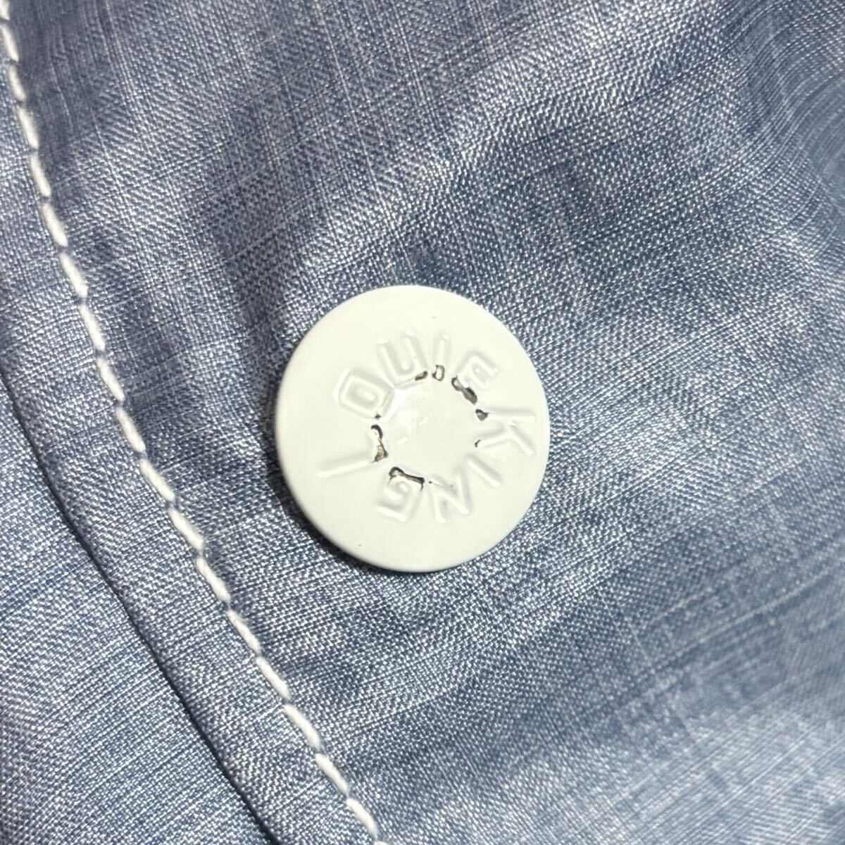 左胸に企業プリント入り、ボタンはロゴ刻印入りのスナップボタン。