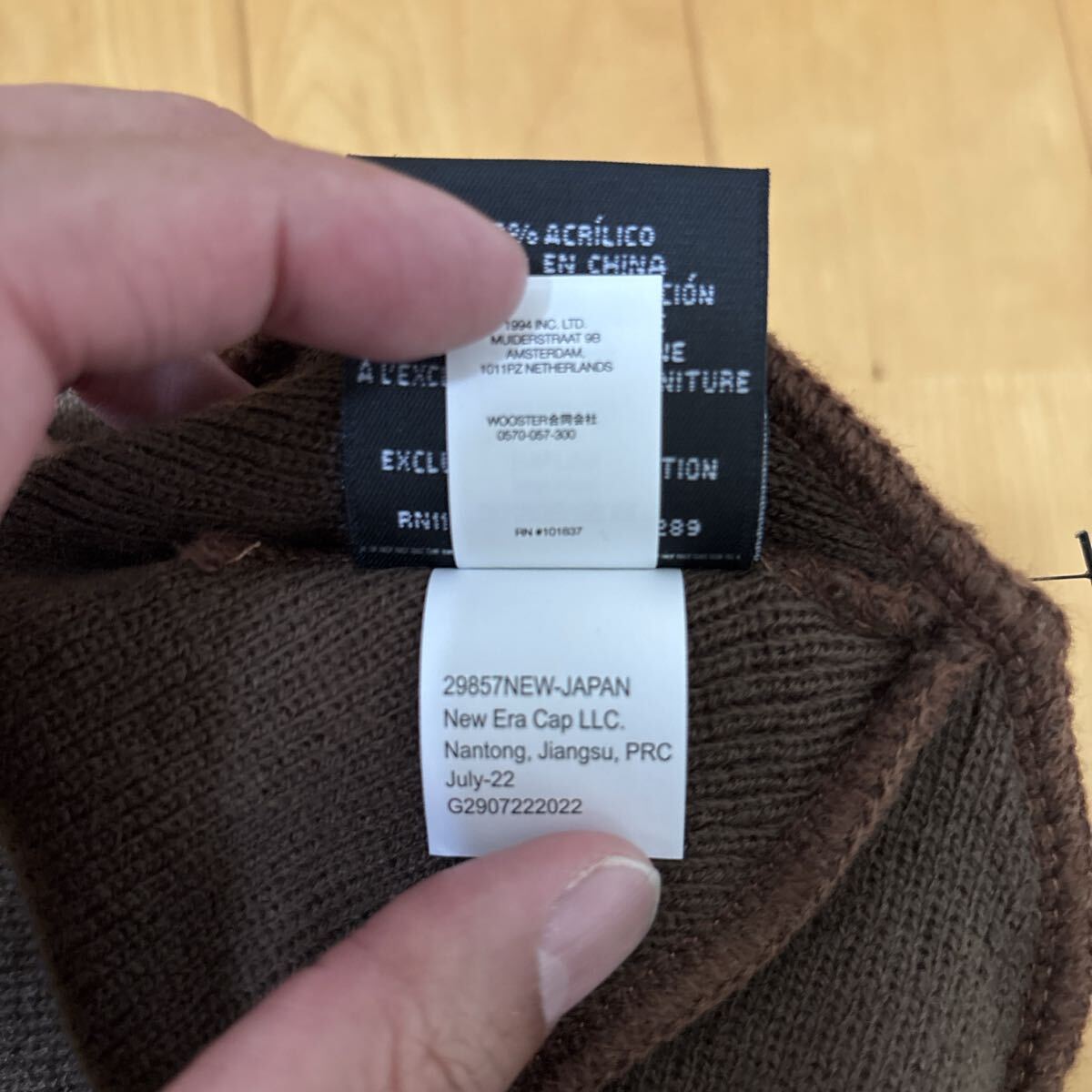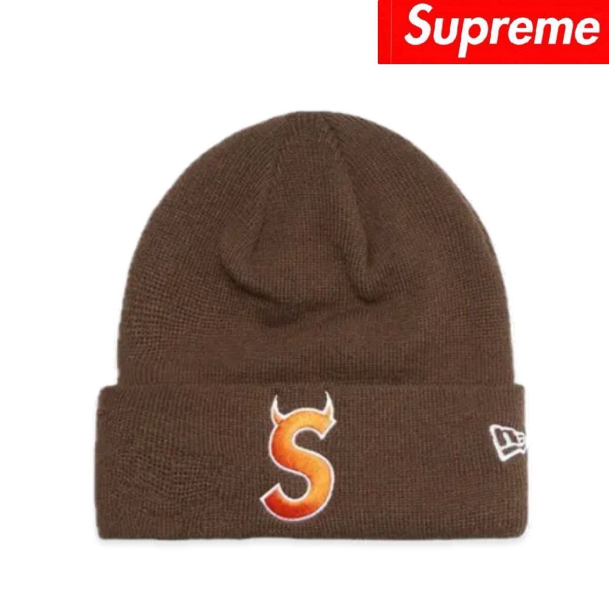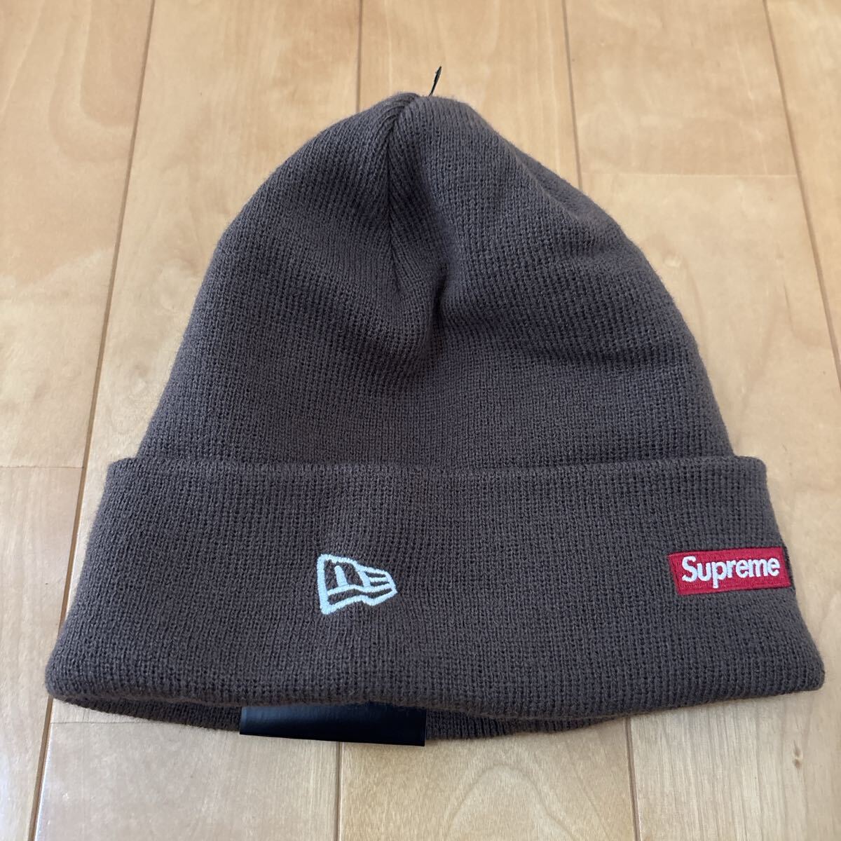 ブラウンのニット帽、SupremeとNew Eraのロゴ付き。