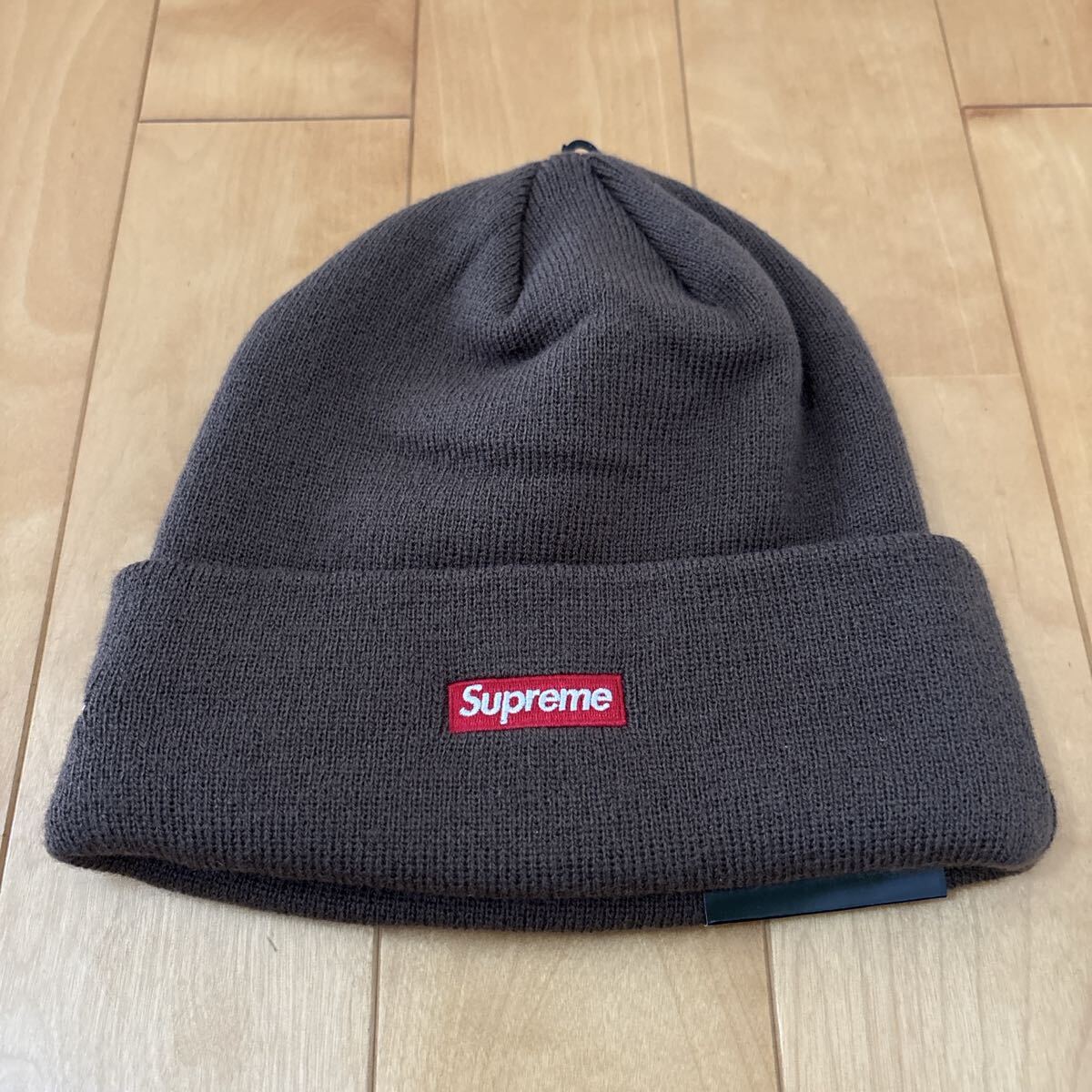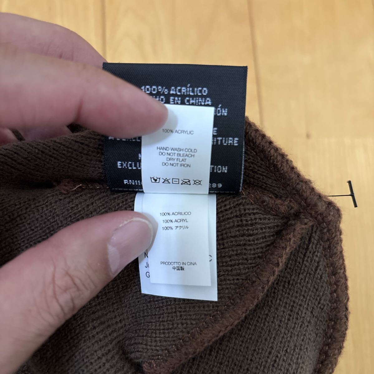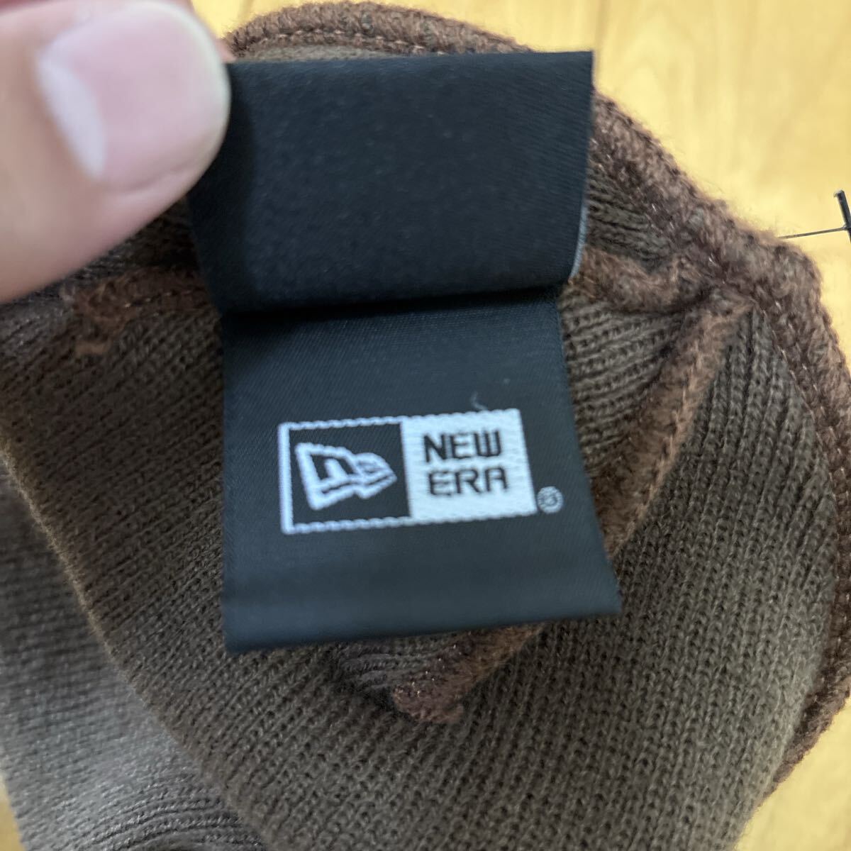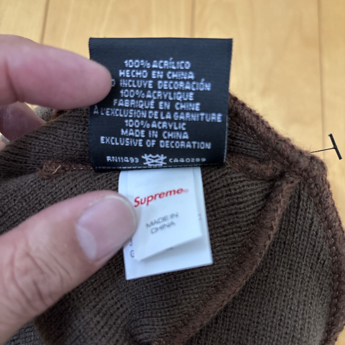 ブラウンのニット帽、SupremeとNew Eraのロゴ付き。