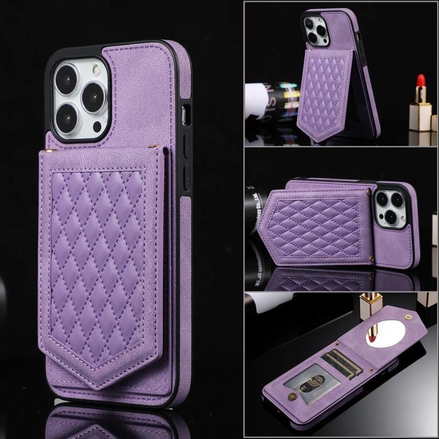 【パープル】iPhone7/8/SE(第2・第3世代) ミラー付 スマホケース カード収納 スタンド ストラップ付 スマホ ショルダー B88