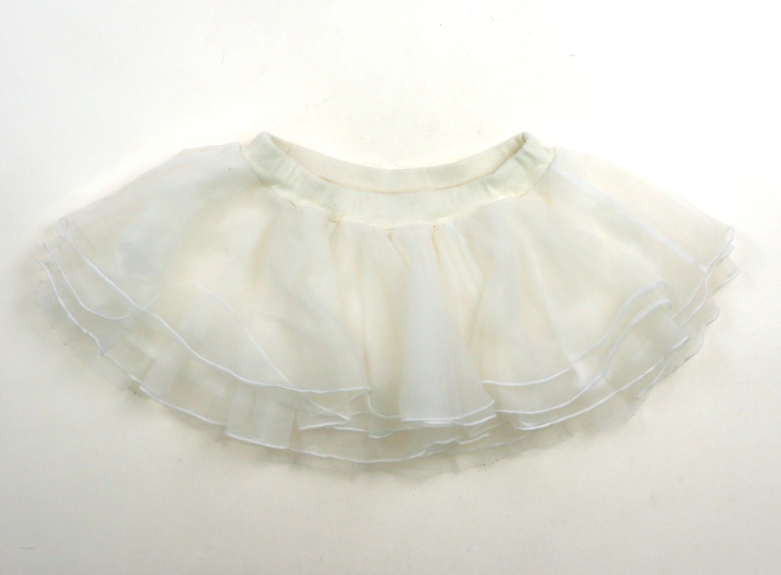 表地はチュール三枚仕立て。裏地は綿布帛素材。ウエストは総ゴムですがやや伸びています。交換穴あり。前身頃裾と後ろ身頃裾に茶色い汚れがあります。チュールに小さなひっかき跡が複数あります。