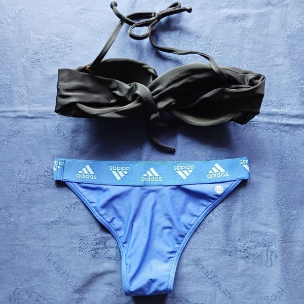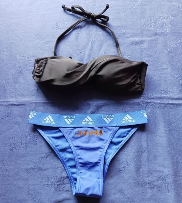 ビーチバレーで使用したビキニです。上下マッチングセット。着用回数少ないので生地、ゴムともしっかりしています。わずかに繊維に砂の入り込みがありますが目立ちません。きれいに洗濯していますので衛生的です。着用に伴いマークの割れや擦れがありますのでご了承ください。スイムボトムM~Lサイズくらい(採寸横約32cm、やや強めに伸ばして約46cm、縦約22cm)。とてもよく伸びます。スイムブラA/Bカップ。