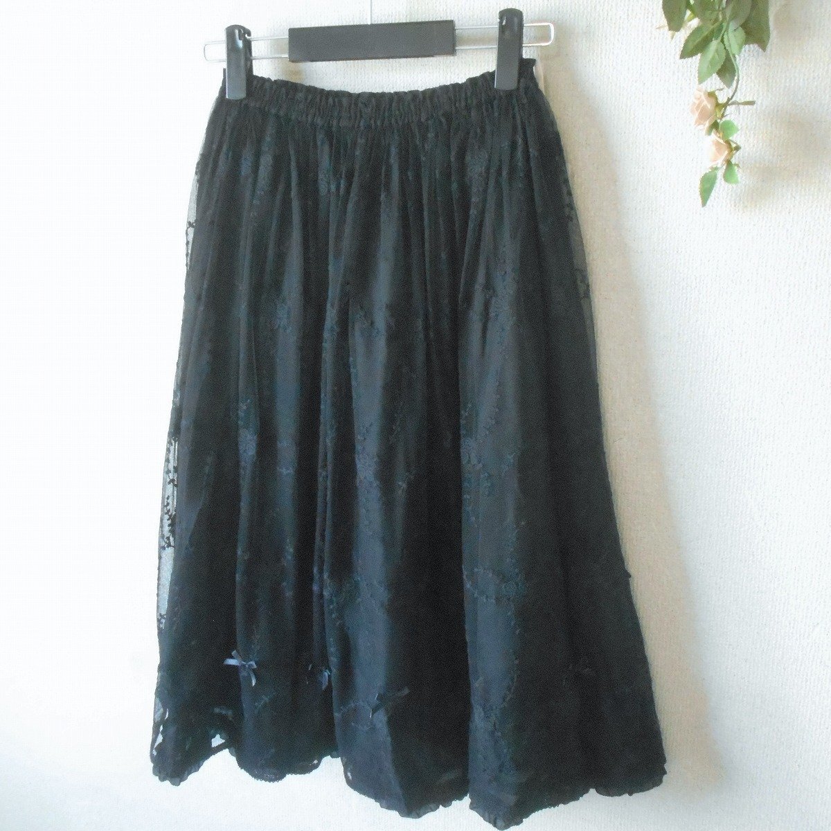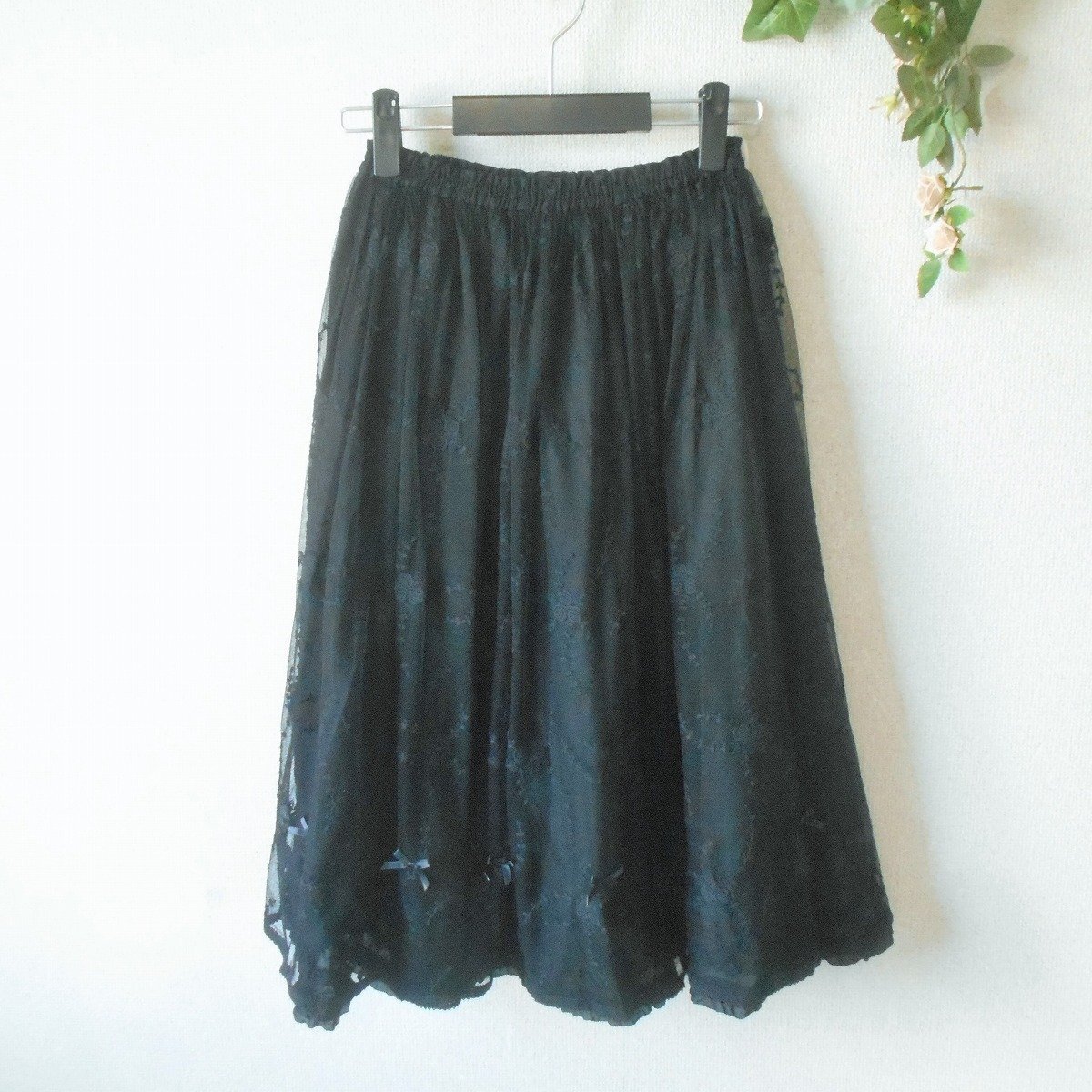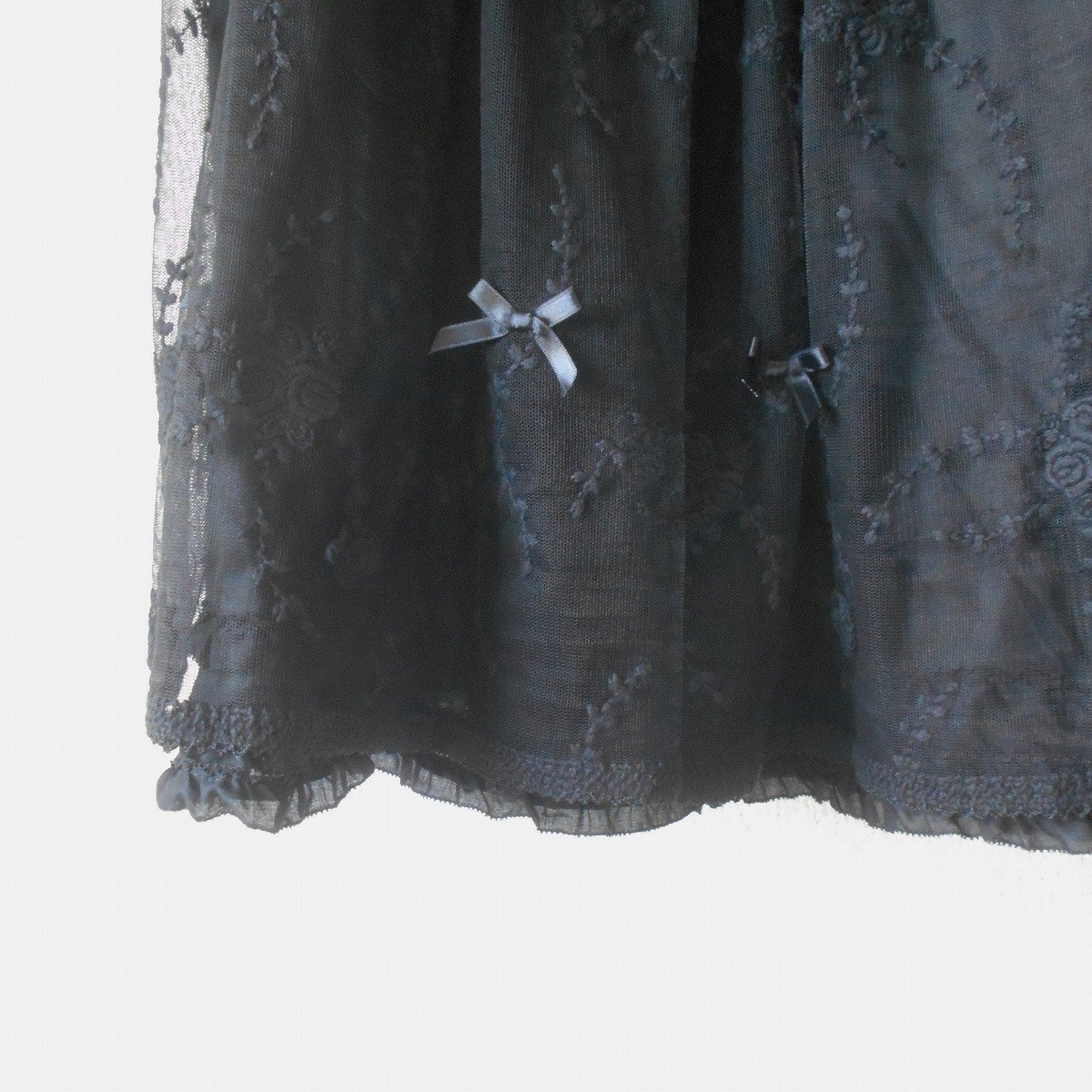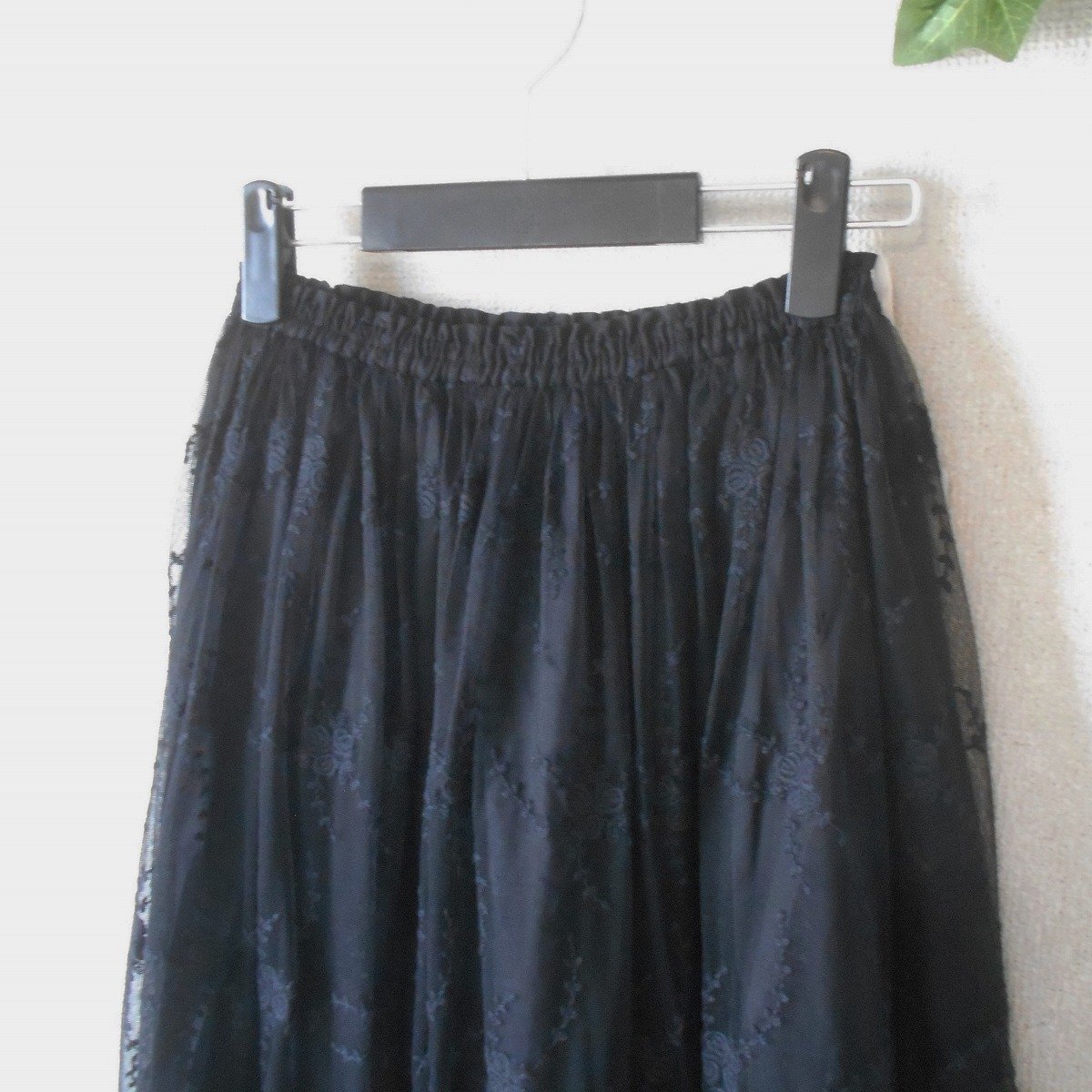 【ポイント】ピンクハウスのスカートになります。お色は黒色で、総チュールにお花の刺繍が入っています。裾の方にはお花のモチーフやリボンが付いていて、裾はインナーに付いたフリルが見える、とっても素敵なデザインです。