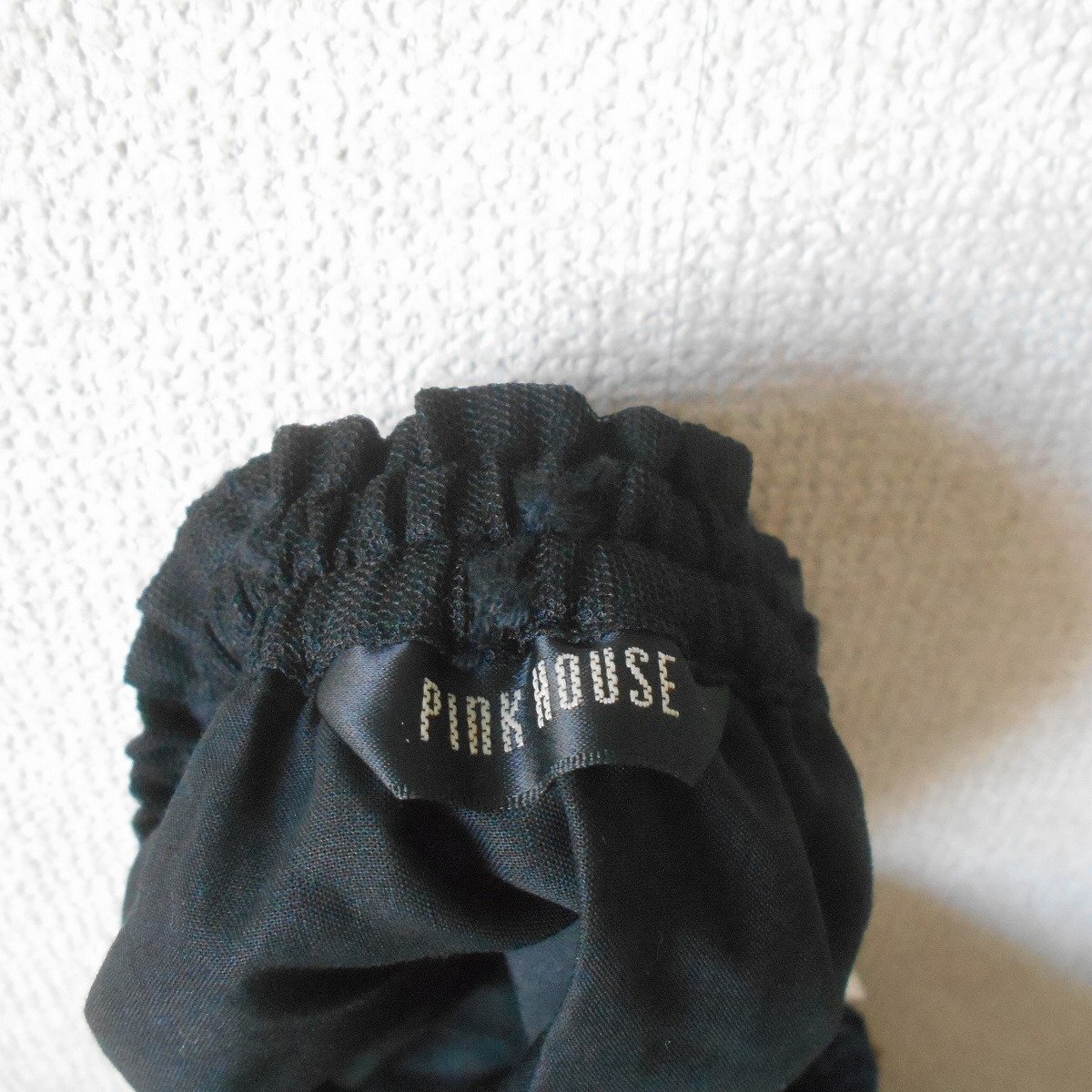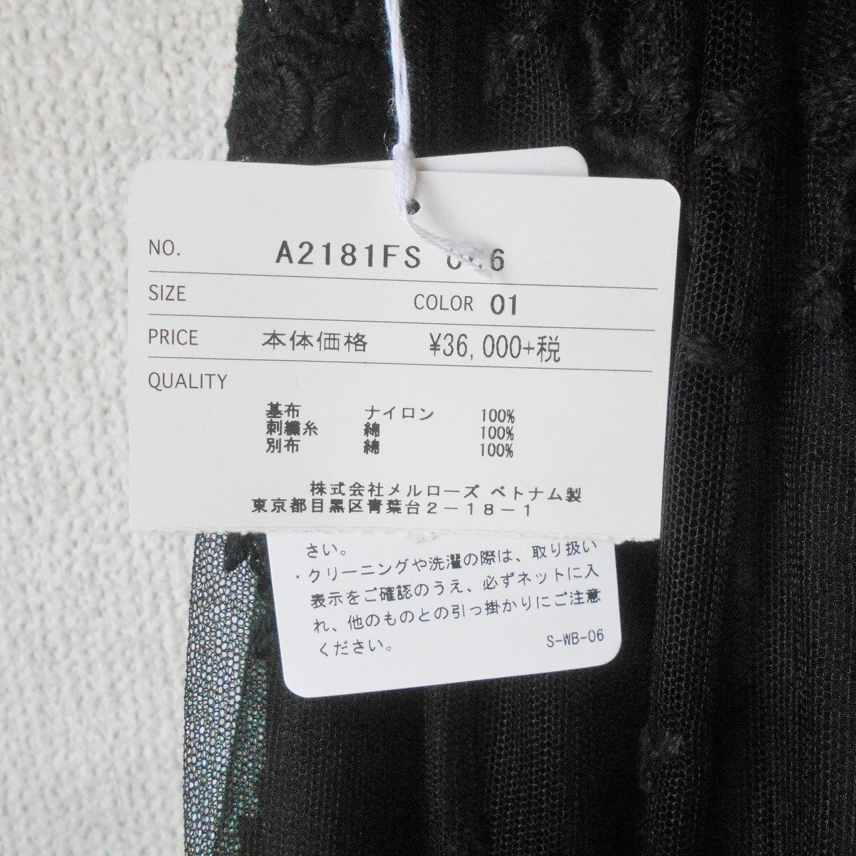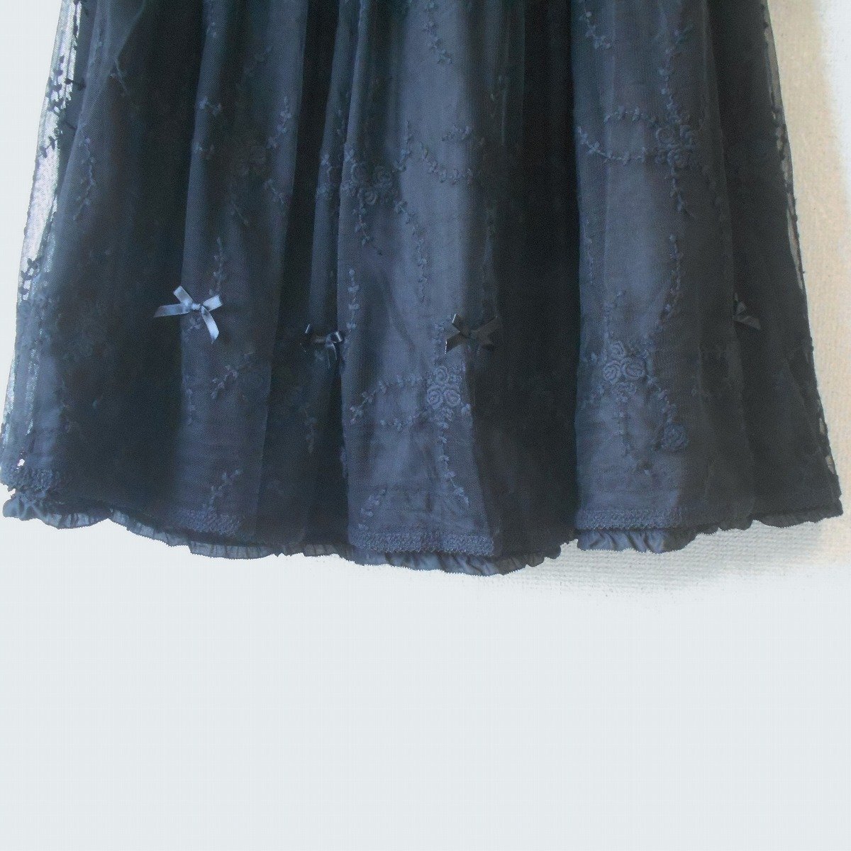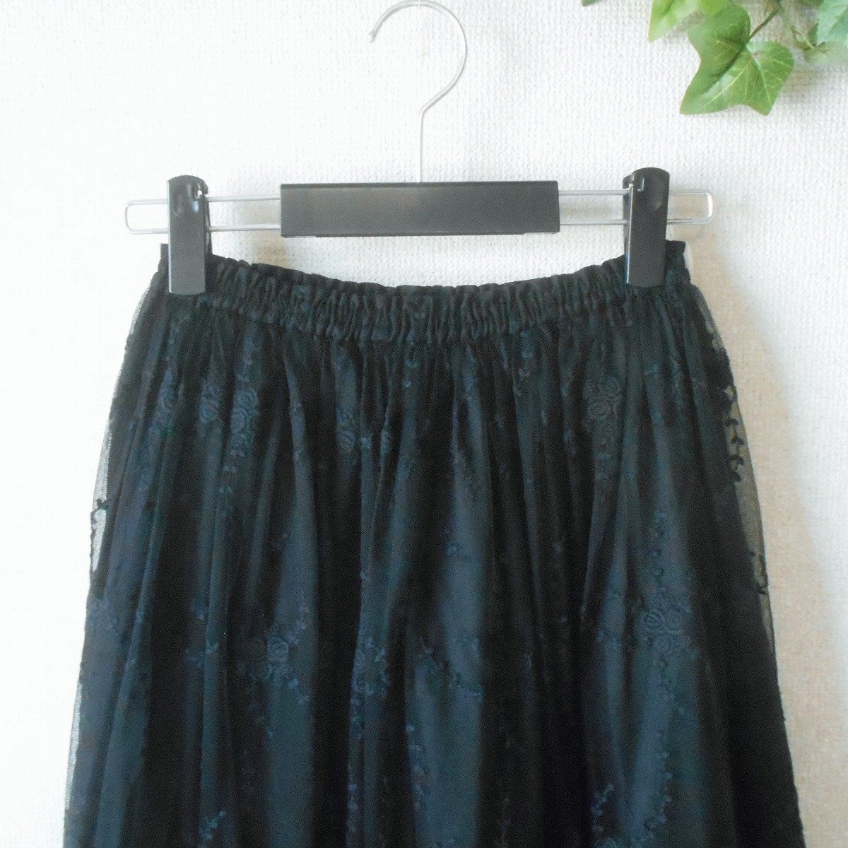 【ポイント】ピンクハウスのスカートになります。お色は黒色で、総チュールにお花の刺繍が入っています。裾の方にはお花のモチーフやリボンが付いていて、裾はインナーに付いたフリルが見える、とっても素敵なデザインです。