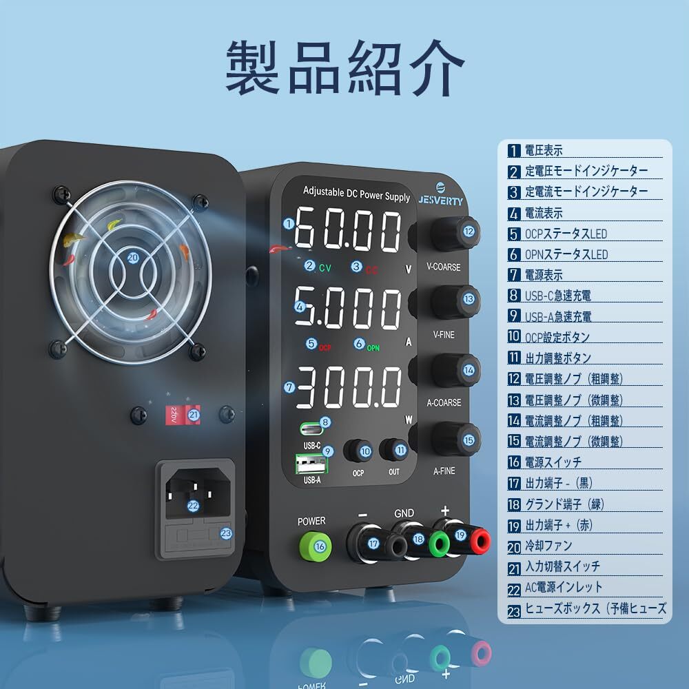 • ⑤【コンパクト&軽量】:Jesvertyの電子機器用電源はさらにコンパクトで、サイズはわずか180(奥行き)×85(幅)x155(高さ)mmで、重さは約 1.1kg。作業台の貴重なスペースを大幅に節約できます。 研究所、工場製造テスト、メンテナンス修理、バッテリー充電、陽極酸化、電子作業DIYなどの用途に最適です!!