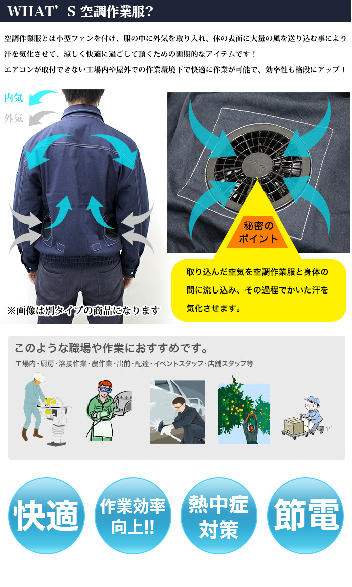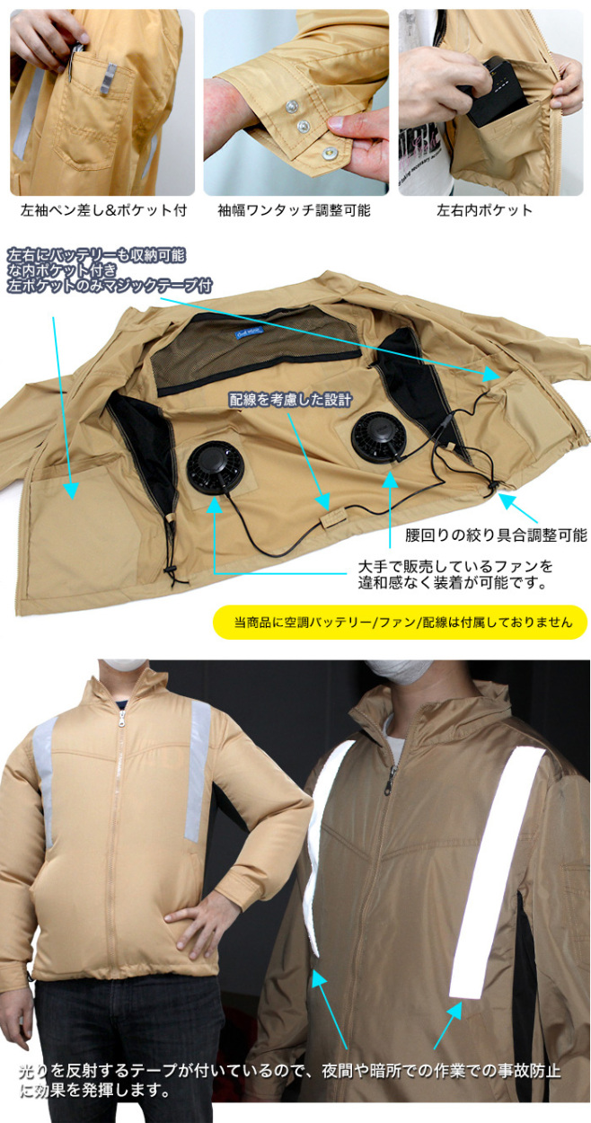 | 軽さと速乾性を両立出来るポリエステル100%素材を採用! 熱を奪い、全体の温度を下げる効果があり、涼しさを保つことが可能で通気性も抜群! 薄手素材になる為、快適に心地よく着られる仕様となっております。 ■カラー ・キャメル/反射テープ【有】 ■サイズ M :身長165〜175cm 胸囲:88〜96cm ※詳しいサイズは画像を参照下さい。 ■適合ファンサイズ:直径約100mm ■素材:ポリエステル100% ■セット内容:空調作業服×1 ※ファン 及び 空調作業服 用 バッテリー は付属しておりません。 ※(株)空調服 の商品では御座いません。 |