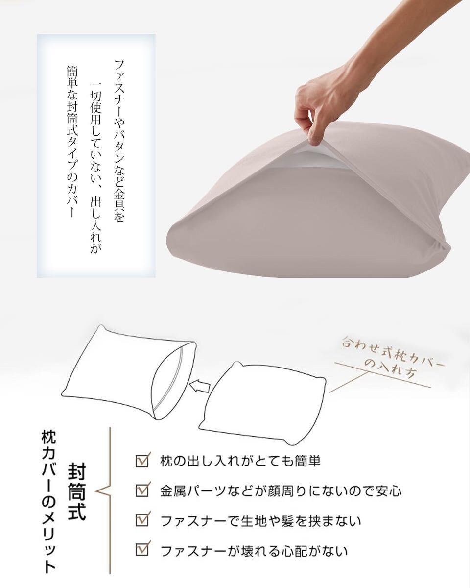 【のびのび素材でどんな枕にもフィット】枕カバー:2枚組。タテにもヨコにも伸縮し、お使いのまくら(低反発枕、湾曲枕、様々な形状の枕)をしっかりカバーします。約40×60cm〜約43×63cm〜約50×70cmの枕にも対応します。枕カバーの素材:ポリエステル95%、ポリウレタン5%。