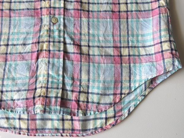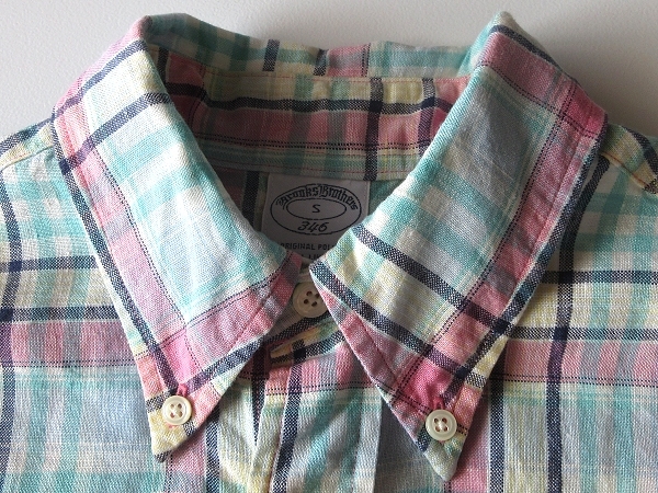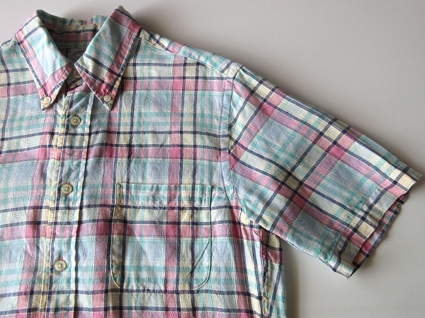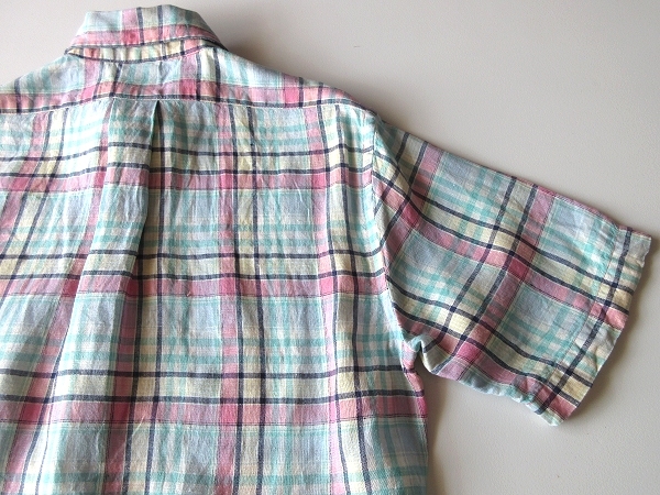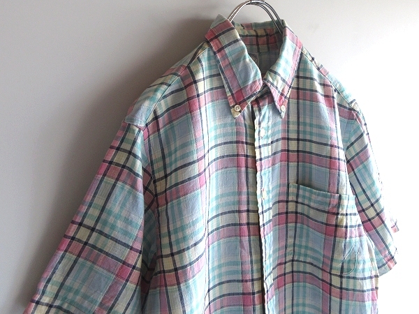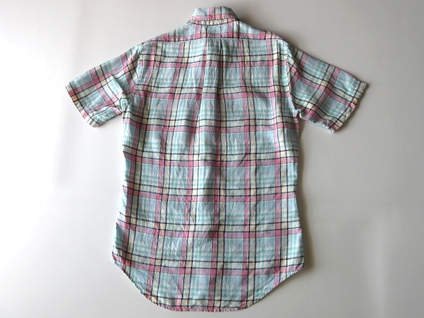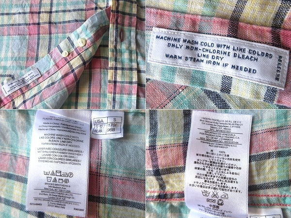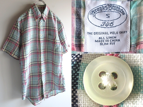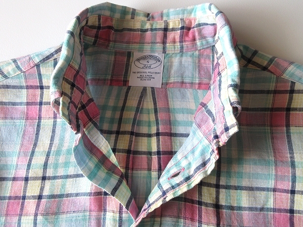 未着用保管品 Brooks Brothers 346 ブルックスブラザーズ SLIM FIT 半袖 リネンシャツ チェック BDシャツ S エメラルド ピンク ネコポス可