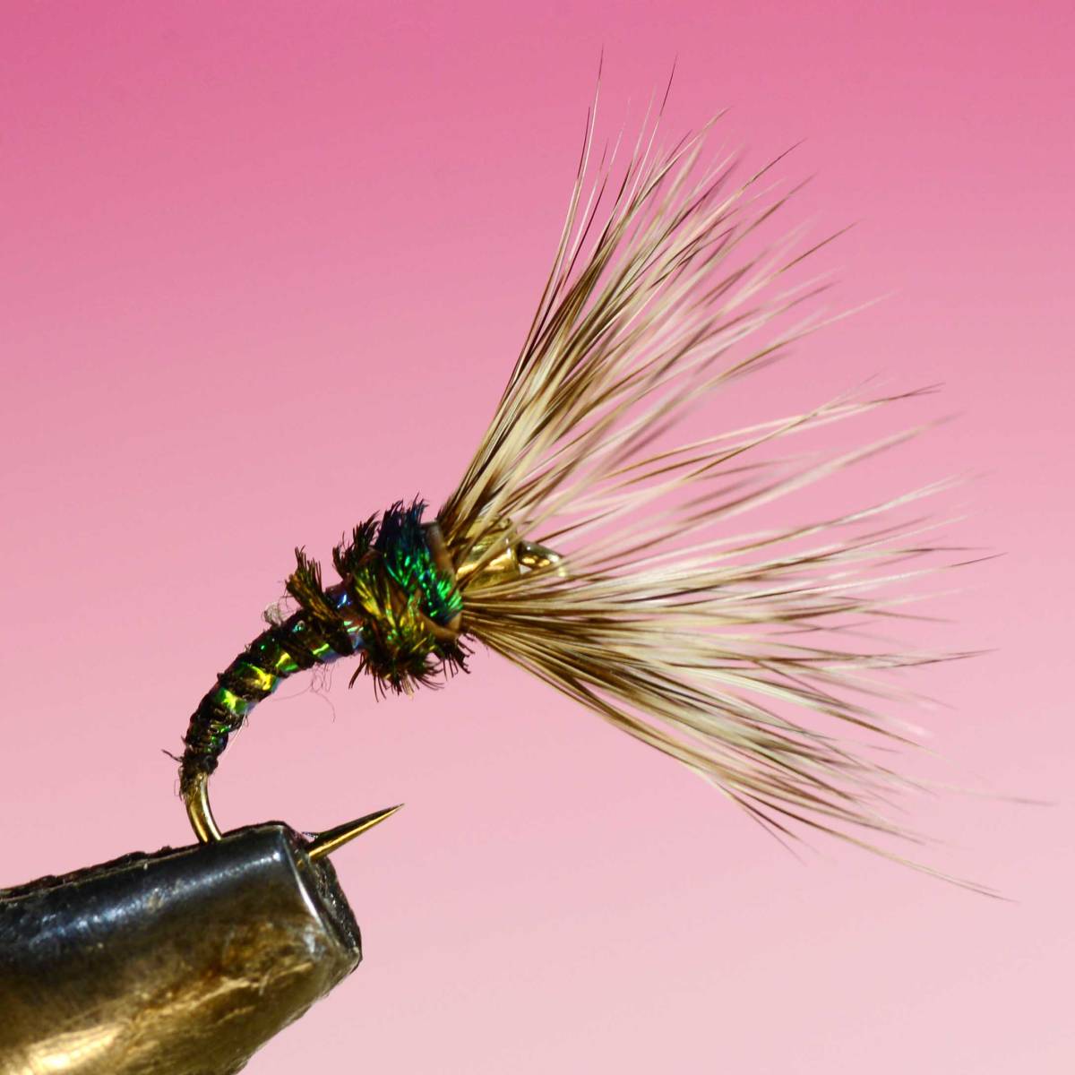 #12のウエットフックにコストが高いMETZのグリズリーハックル+ピーコック+ゴールドビーズでフル装備しました。