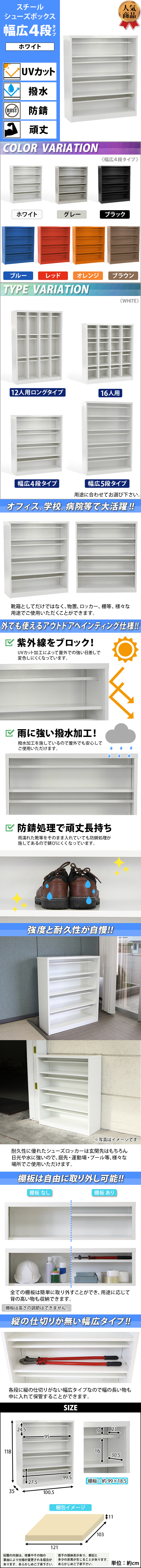 | 商品名 | 送料無料 ロッカー おしゃれ スチール シューズボックス 16人用 幅広4段タイプ オープンタイプ 白 棚板付き 扉なし 1列4段 UVカット 撥水 防錆 頑丈 シューズロッカー シューズラック スリム 更衣ロッカー 靴箱 下駄箱 棚 物置 屋外 中棚 プール ホワイト sy2016bwh |