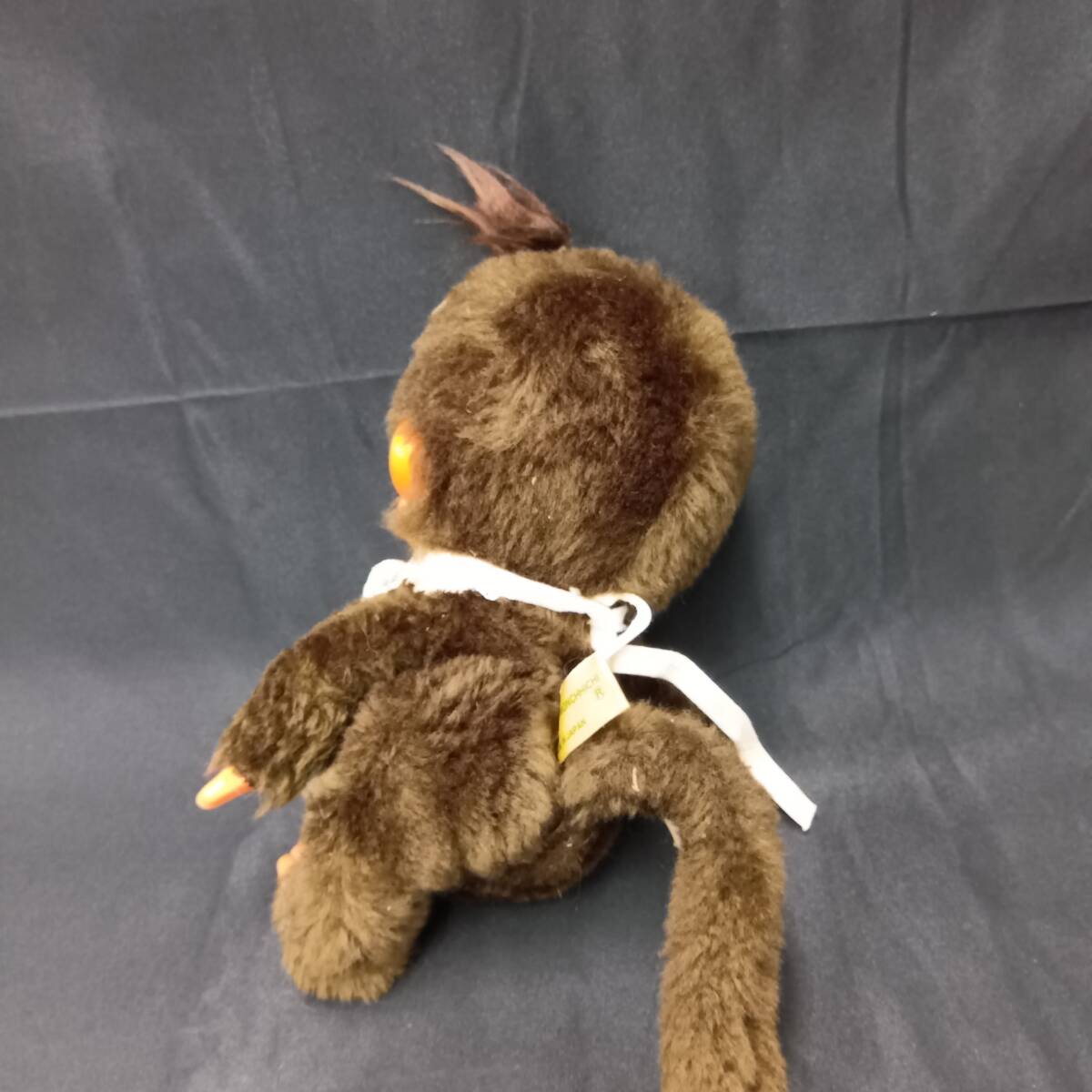 こちらは1970年代~80年代初期にセキグチより発売されたヴィンテージのモンチッチ「ふた子のモンチッチ」です。背中のタグには「Made in Japan」の表記があり、当時の日本製であることを示しています。タグ付きで保存状態もまずまず良好ですが、経年による毛の擦れや細かな汚れが見られます。表情やデザインに昭和レトロな魅力が感じられ、コレクターにもおすすめできる一品です。