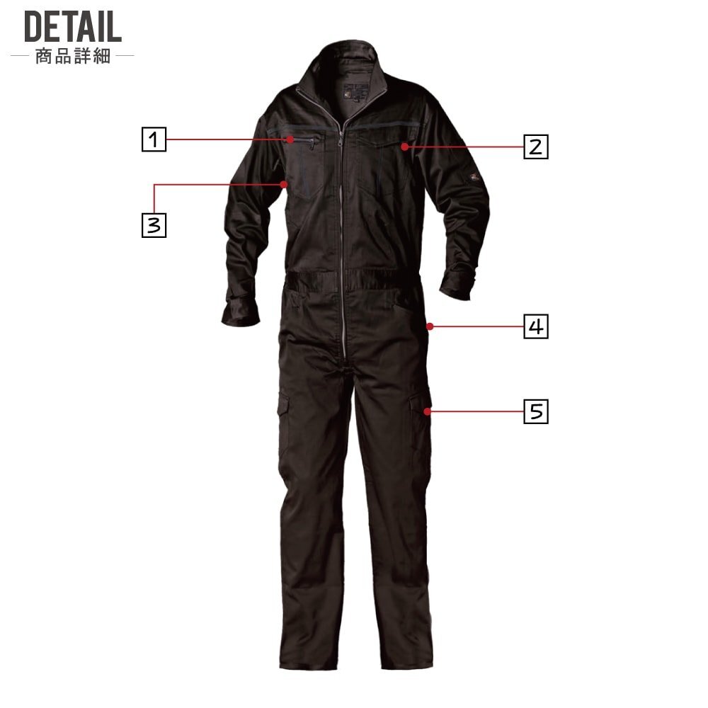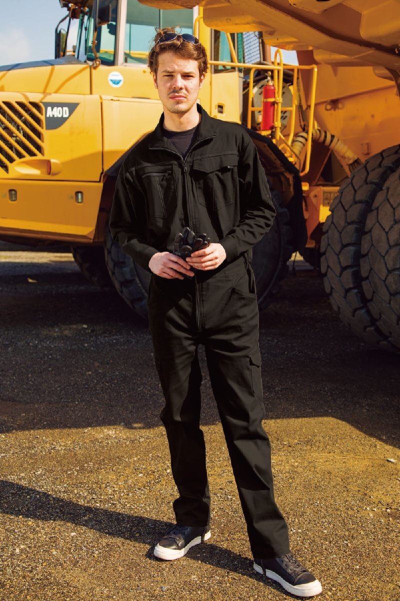 胸元の3本ステッチやファスナーの配置が印象的なワークウェア。