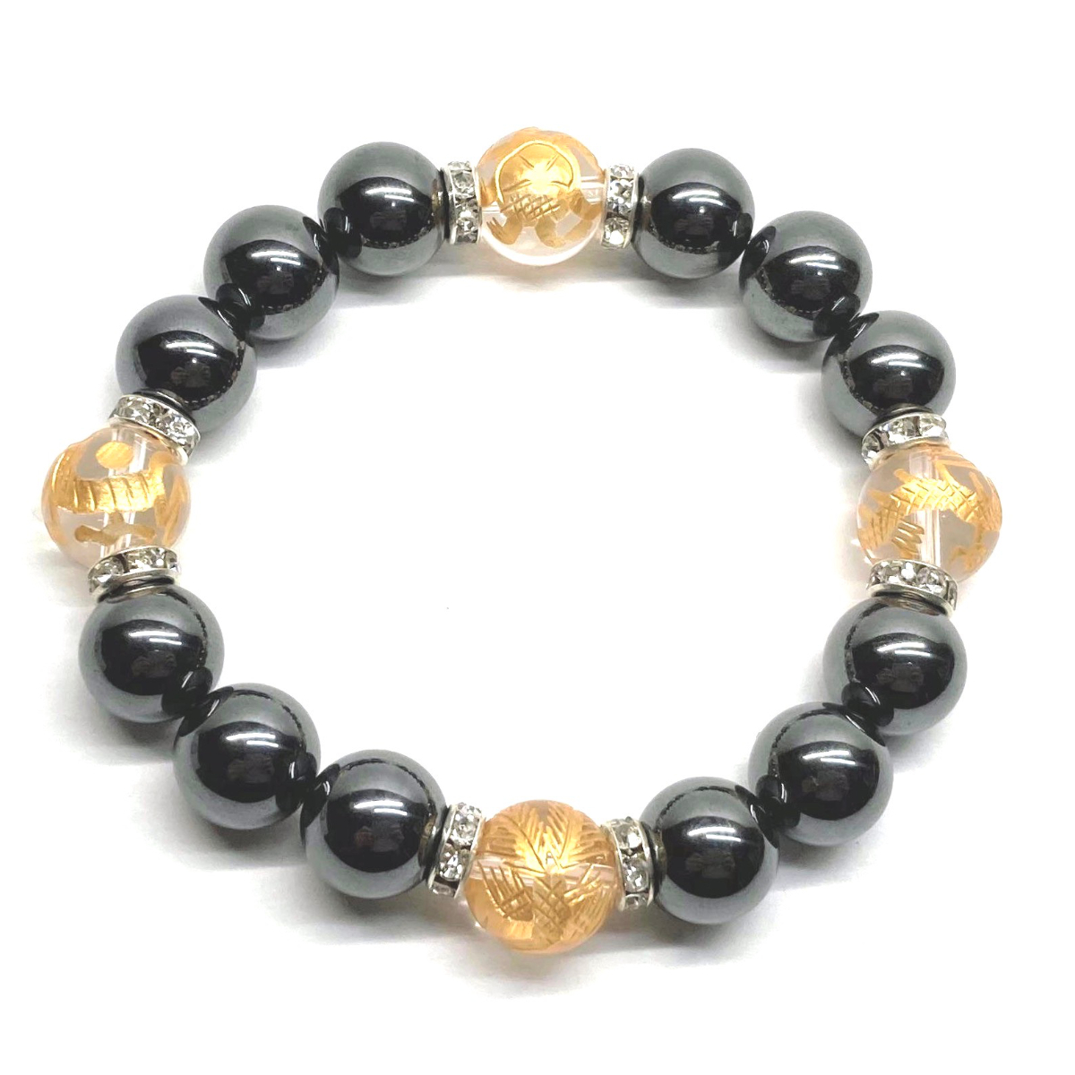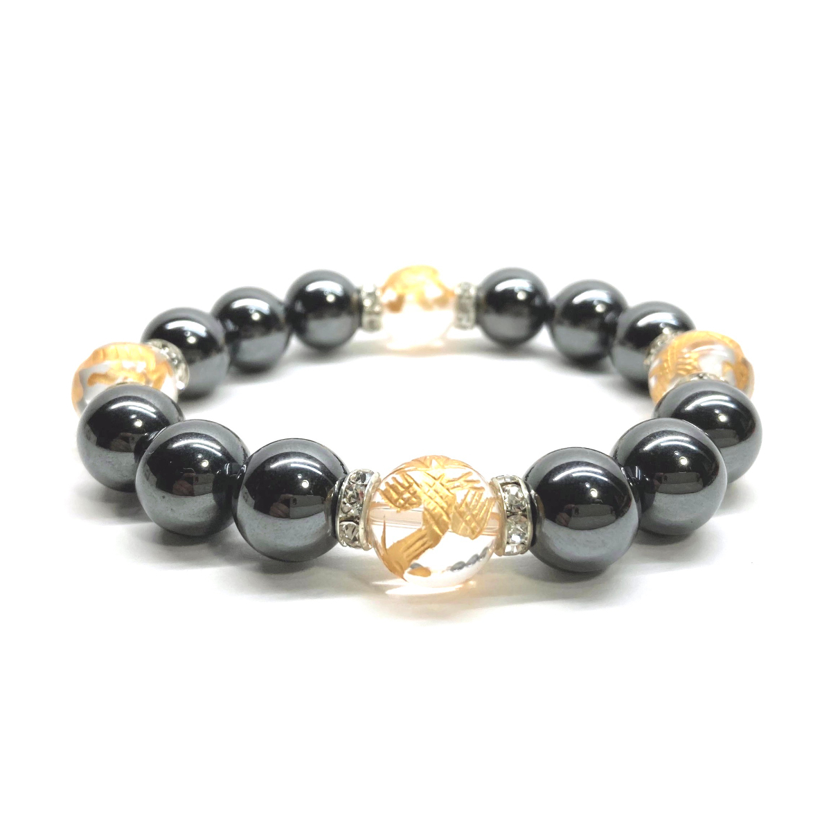 こちらは、四神獣金彫水晶とヘマタイトを組み合わせたパワーストーンブレスレットです。四神獣は、中国の伝説で4つの方向(東西南北)を守護する神聖な神。四神獣、厄災から身を守り、多くの運気を呼び込むと言われております。石大きさは程よくインパクトのある12mm玉で内周 約17cmです。 数に限りがございますので気になる方はお早めにどうぞ。