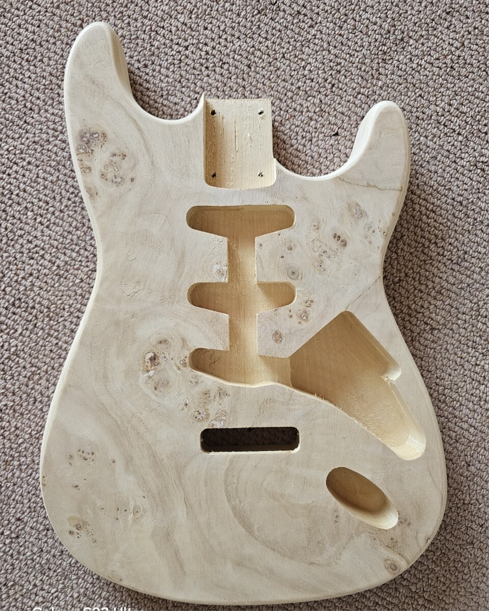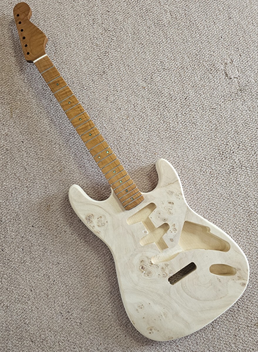 ネックはメイプル、ボディーはどちらかというと軽量ですのでバスウッドかと思います。