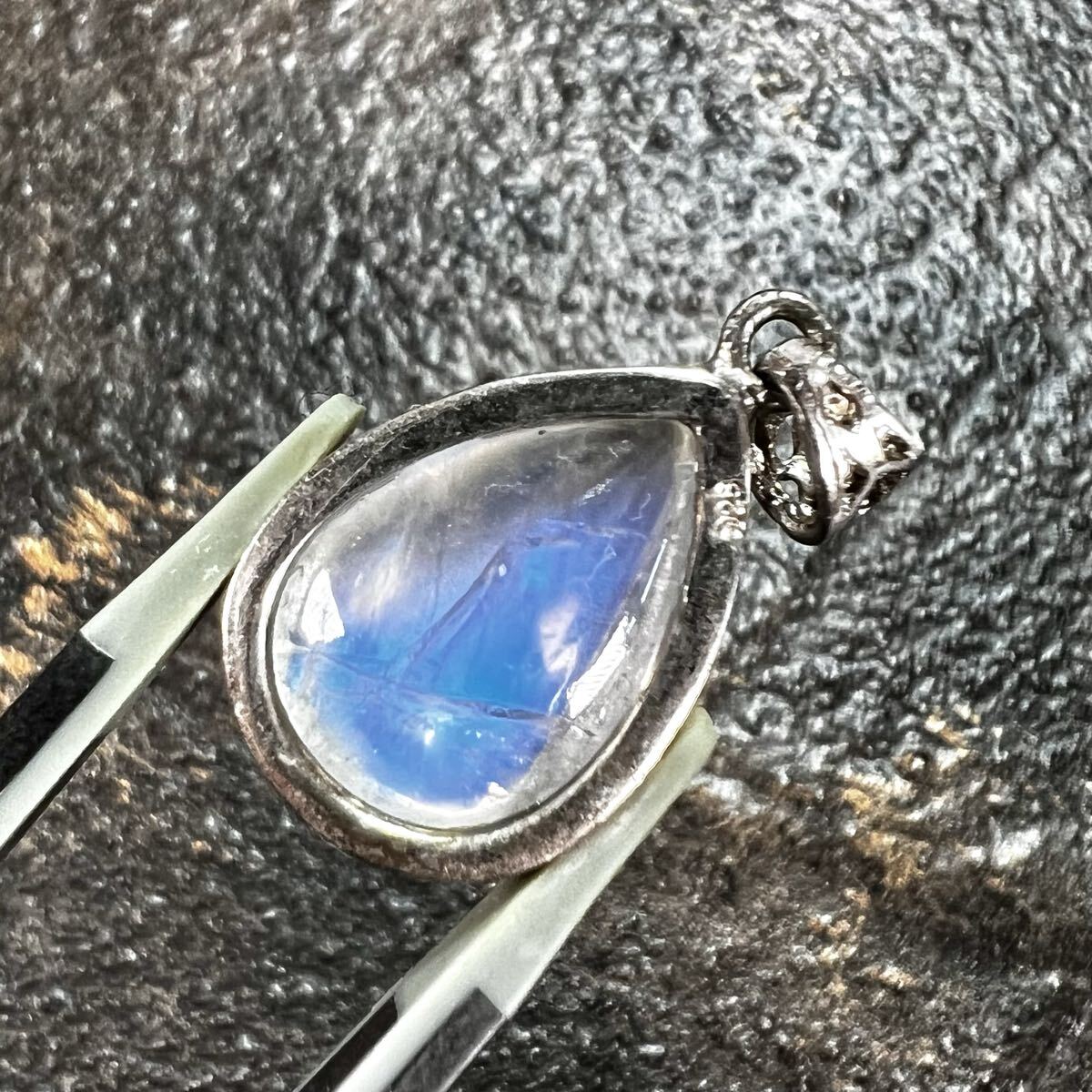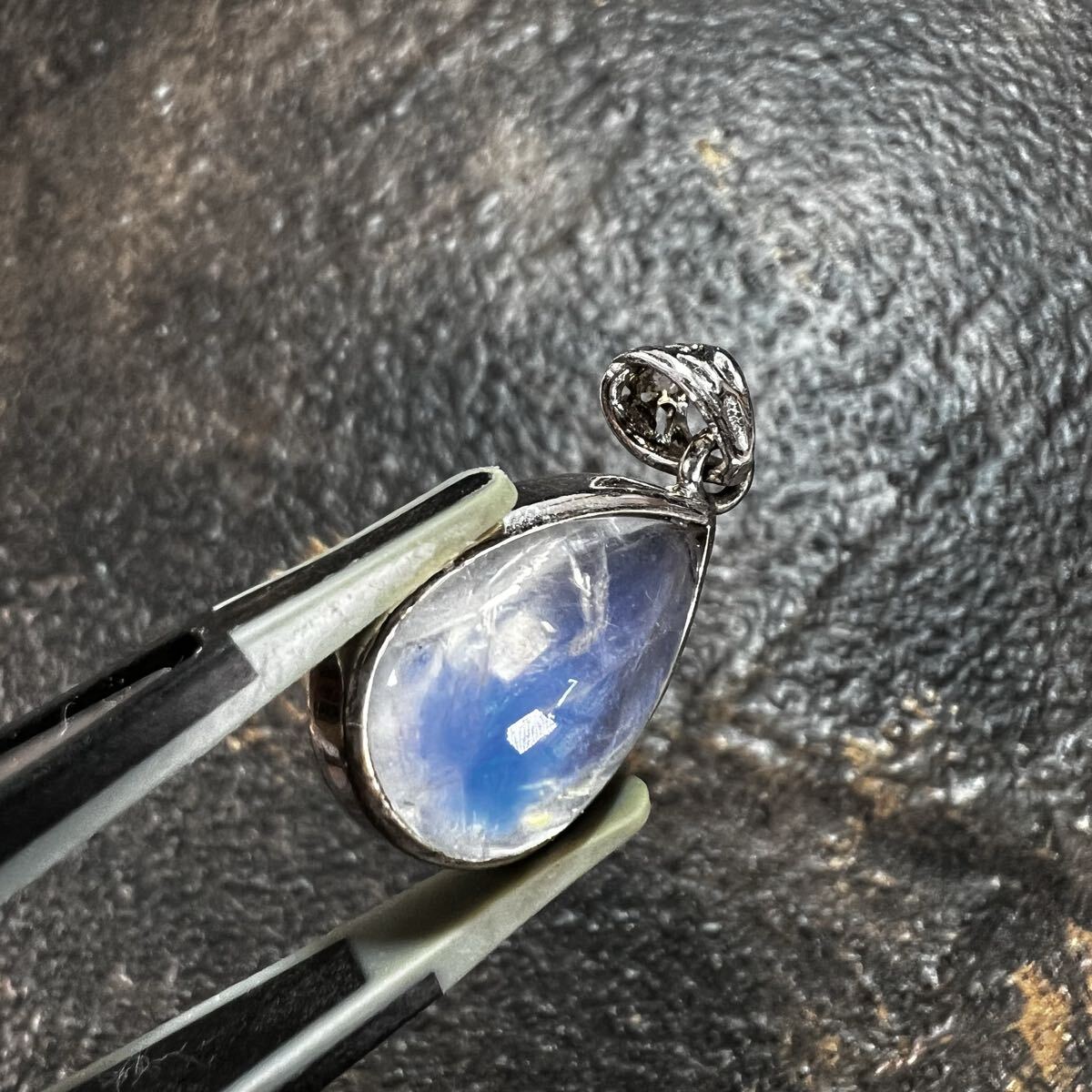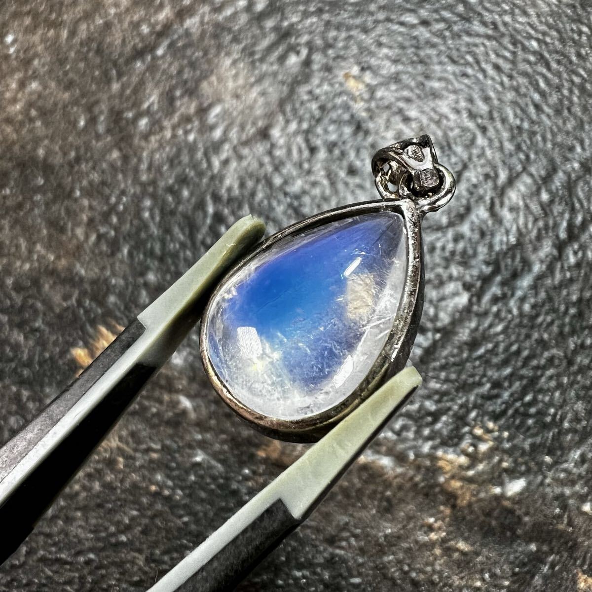 透明感のあるホワイトに、強く輝くシラー(光の反射)が神秘的な天然石「ホワイトラブラドライト」のペンダントトップです。