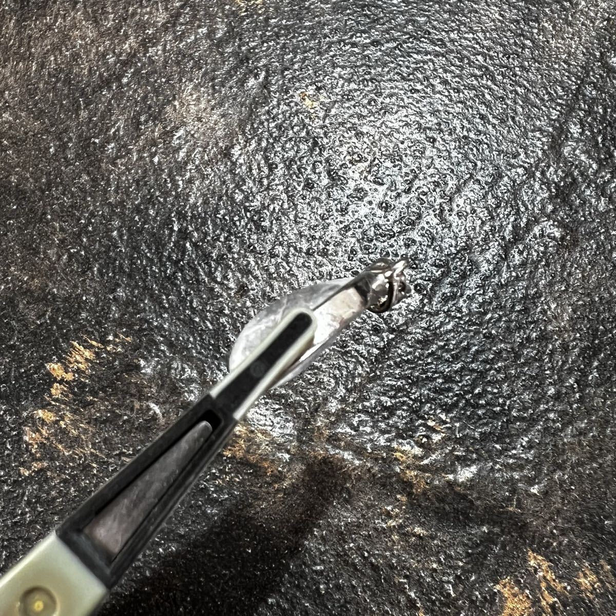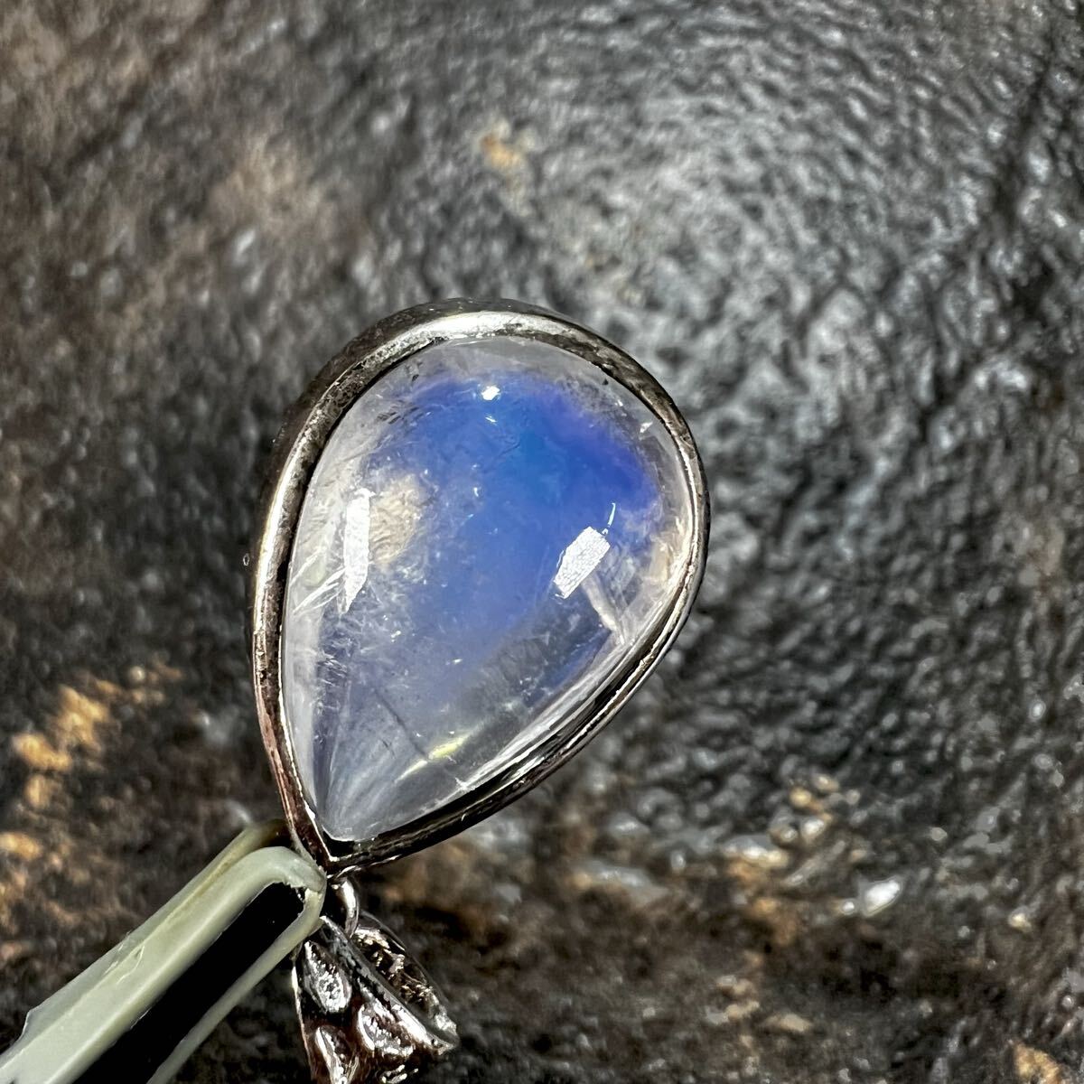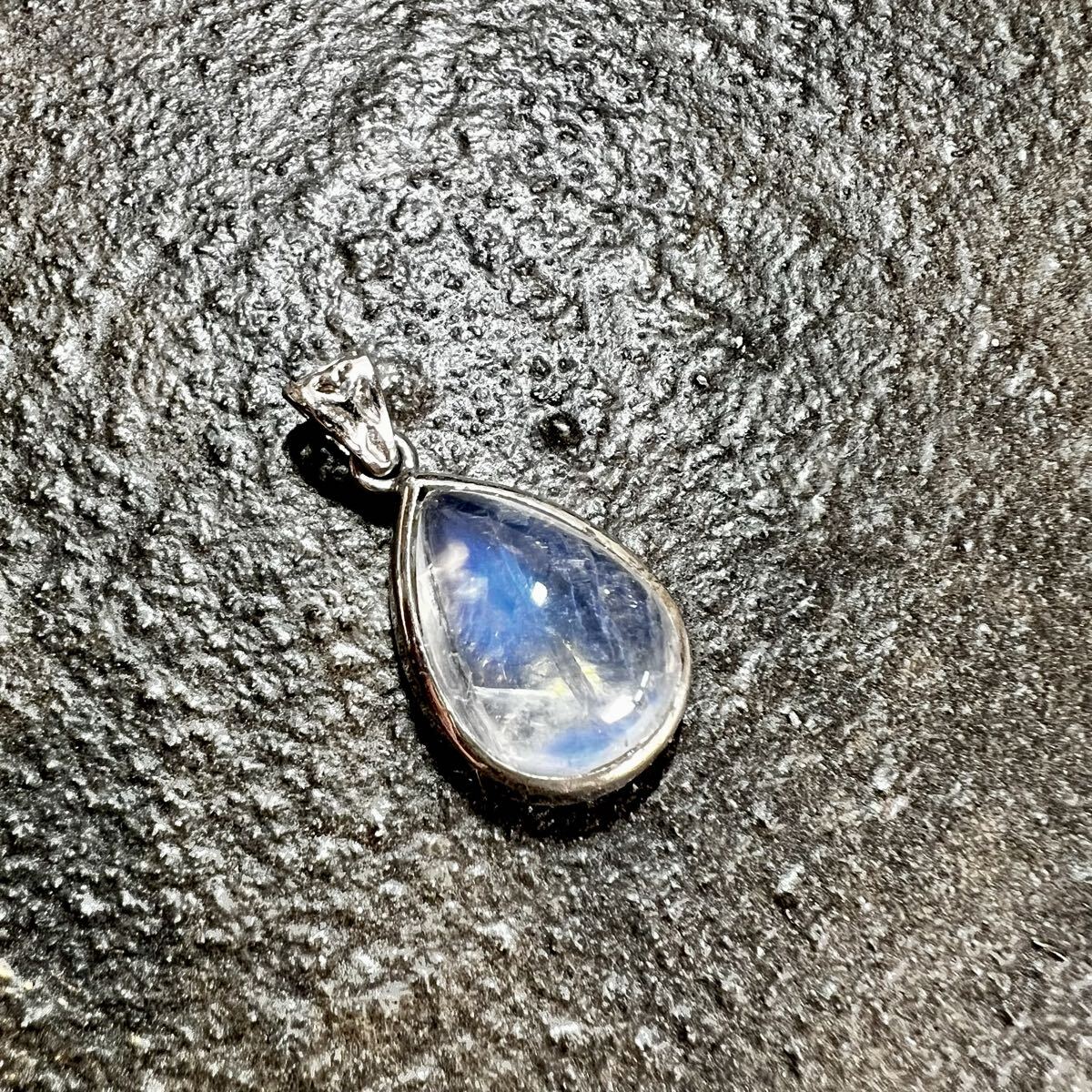 透明感のあるホワイトに、強く輝くシラー(光の反射)が神秘的な天然石「ホワイトラブラドライト」のペンダントトップです。
