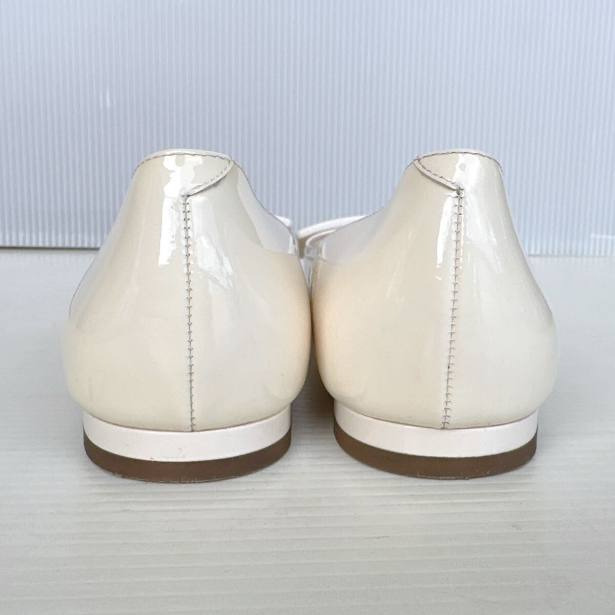 大きなスクエアバックルを飾ったエレガントな雰囲気のエナメルレザーフラットシューズ。
