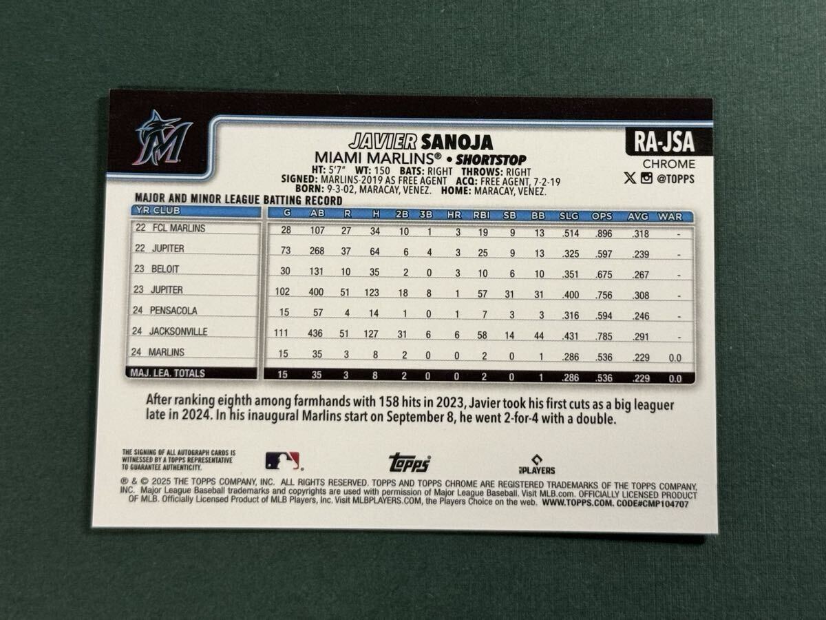 Javier Sanoja RC On Card Auto 2025 Topps Chrome Autograph MLBカード 直筆サイン ルーキー Marlins