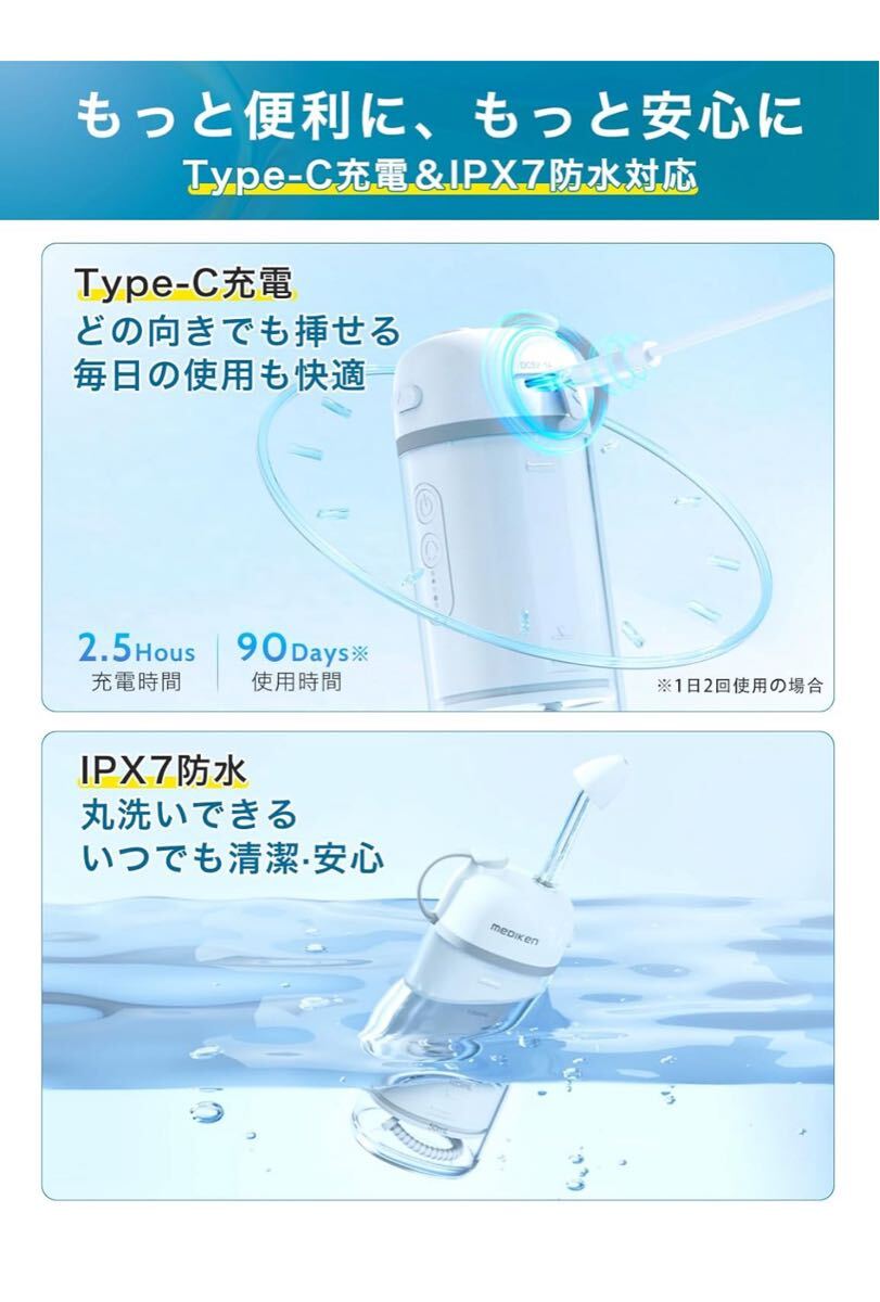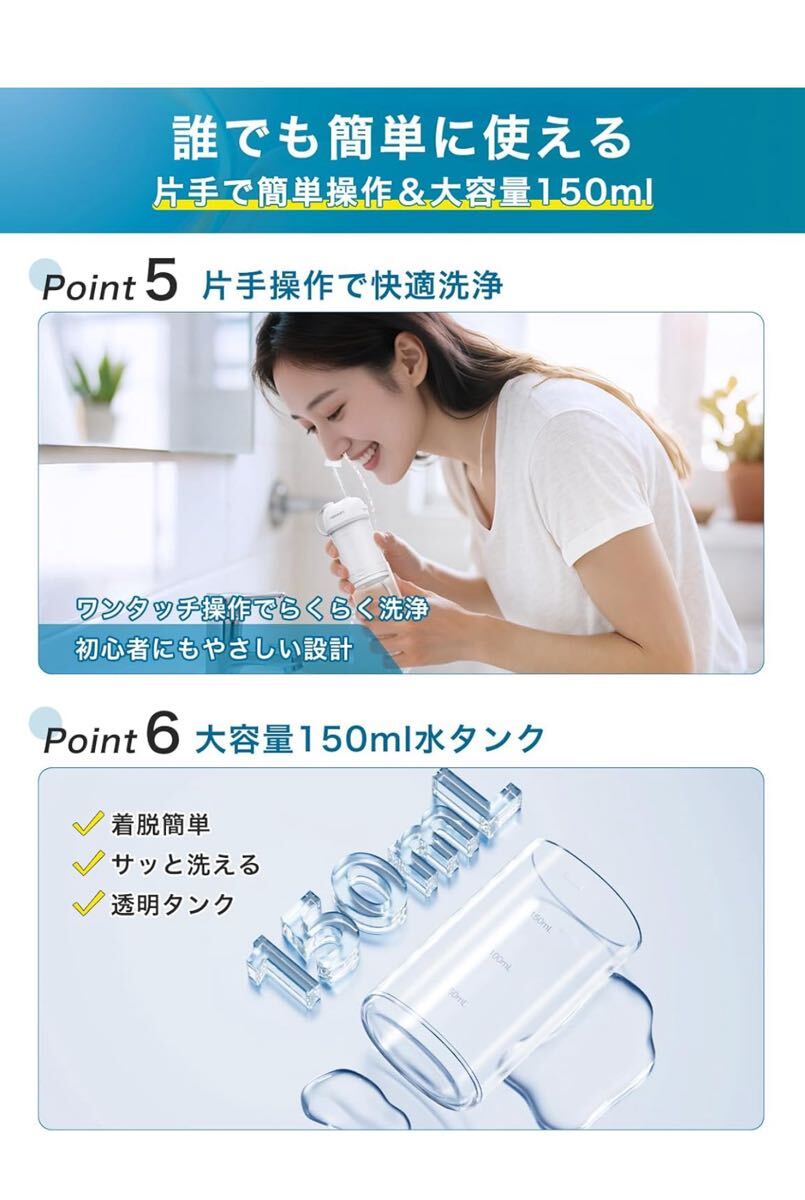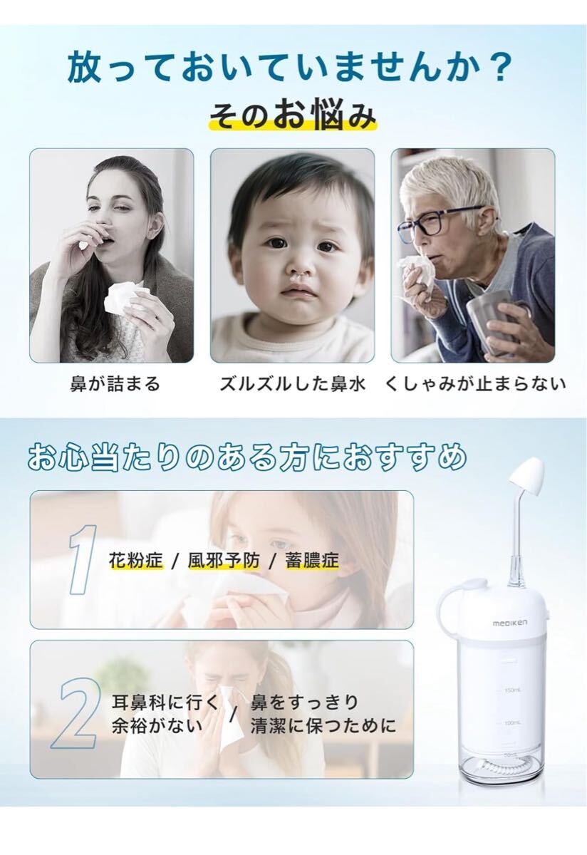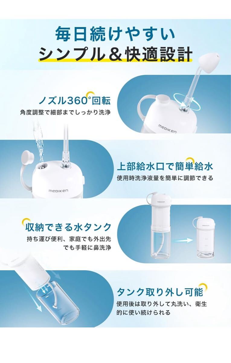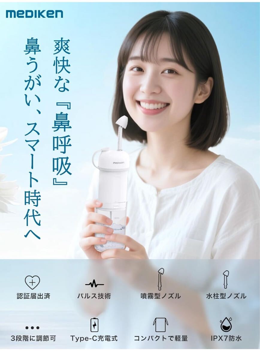 電動鼻洗浄器 鼻うがい 鼻洗浄 強・中・弱モード対応 脈動式可変水流技術 霧状ノズルと水柱ノズル 150ML水タンク 収納できる水タンク&コンパクト 360°回転ノズル Type-C充電 IPX7防水 子供から大人まで全年齢に適用 収納袋付き 携帯便利 ME117 ホワイト