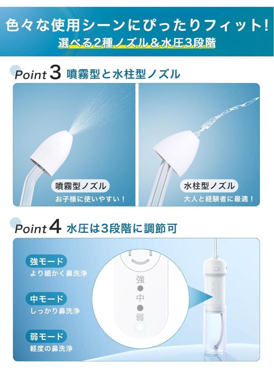 【 2種類の交換ノズル付き・用途に応じて選択可能】霧状ノズルと水柱ノズルの2種類を搭載し、異なるニーズに対応。霧状ノズルは微細なミストでやさしく洗浄でき、特に子供や初心者に最適。水柱ノズルは強力な水流で鼻腔をしっかり洗浄し、鼻詰まりや不快感の緩和をサポートする。