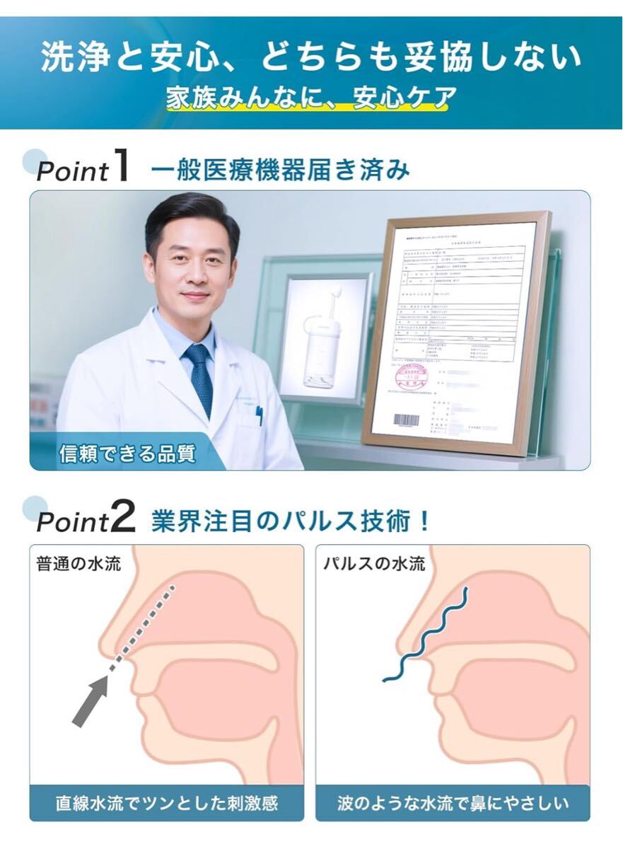 【脈動式可変水流技術で快適な鼻洗浄】最新の脈動式可変水流技術を採用し、効果的に鼻腔を洗浄しながらも強すぎる水流による刺激を防止。デリケートな鼻粘膜を傷つけることなく、子供・高齢者・敏感な方でも快適に使用可能。