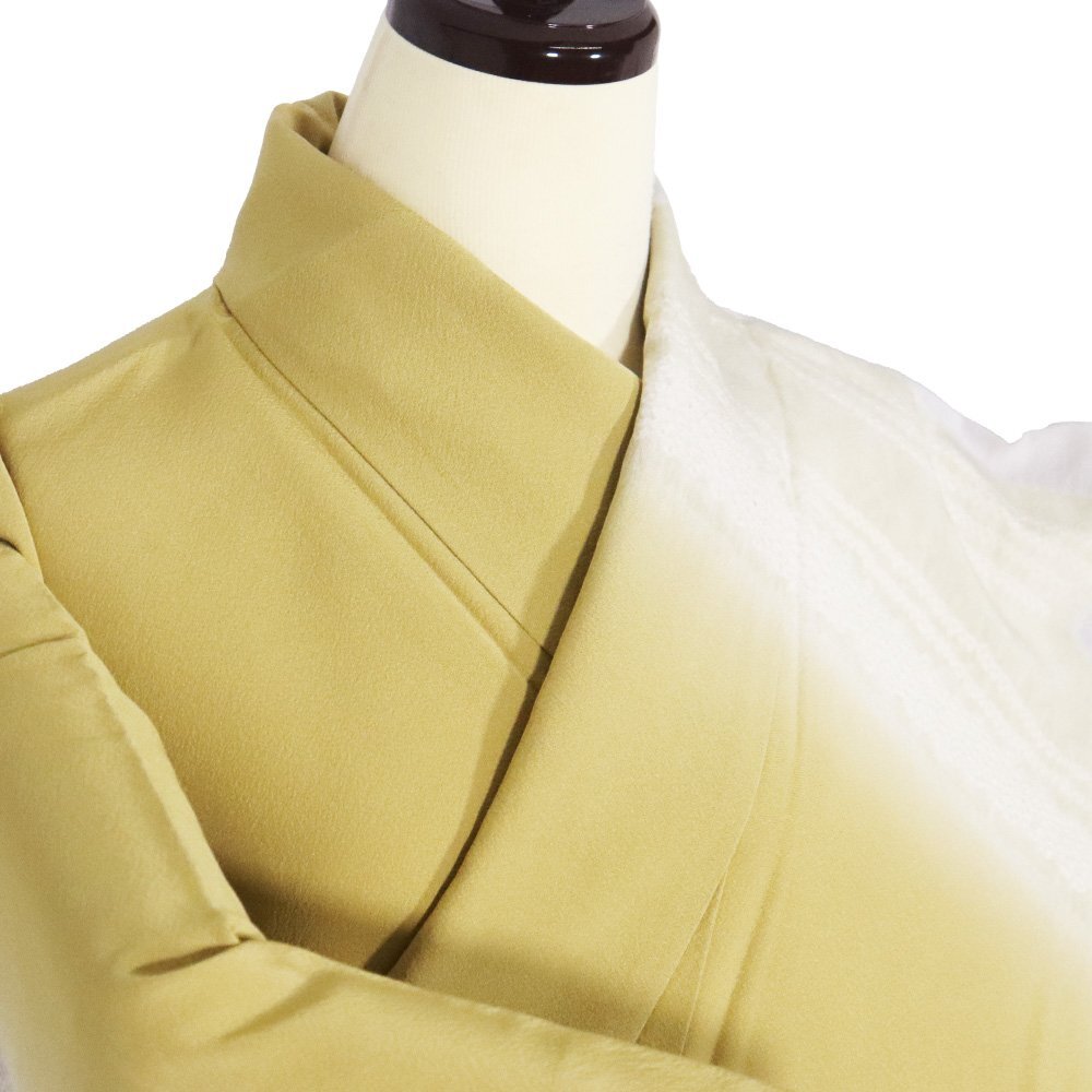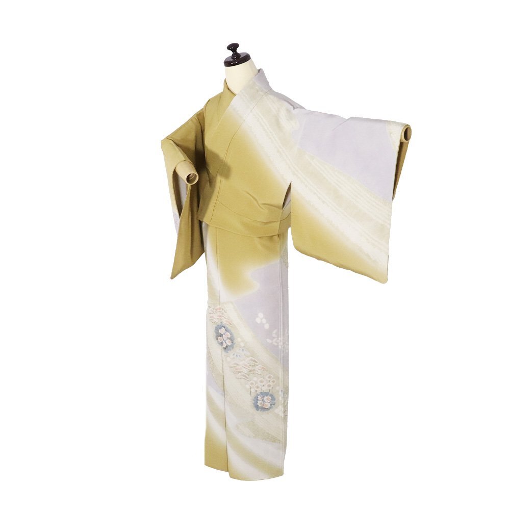 | 滝泰謹製 絞り訪問着 袷 丹後縮緬地 黄土色(黄朽葉色)・薄グレー(灰青色)・ピンク(紫水晶)・緑(花浅葱色)・薄緑(裏葉柳色)地 絞り・松竹梅・七宝文 160 広襟 落款入り | |