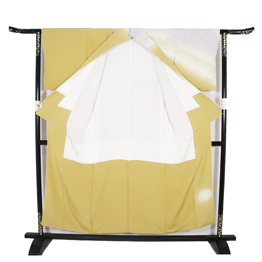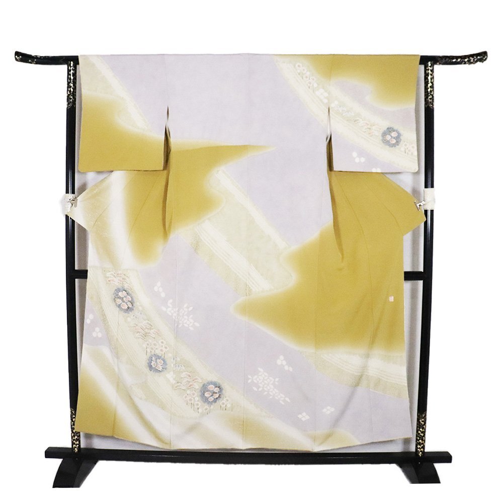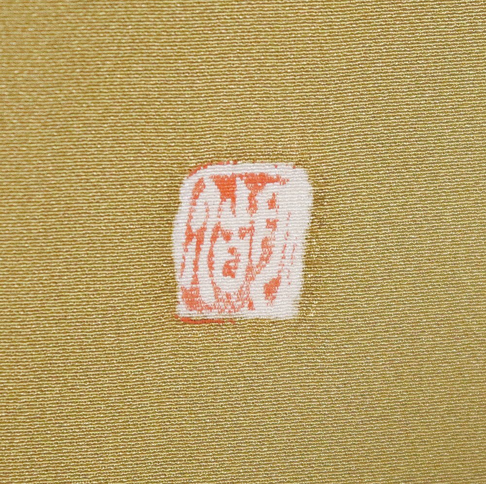 | コメント | 地色は和色大辞典より黄朽葉色・灰青色・紫水晶色・ 花浅葱色・裏葉柳色に近いと思います。 右前身頃衽に落款入り。 滝泰謹製 この訪問着は地色・柄はもちろんのこと 装飾などの細かい所にまでこだわっています。 模様も上品で、 照明や太陽の光にあたると、とても豪華にみえます。 とても上品な訪問着です。 生地の状態は良いと思います。 目立ったシミ汚れはないと思います。 美品です。 |