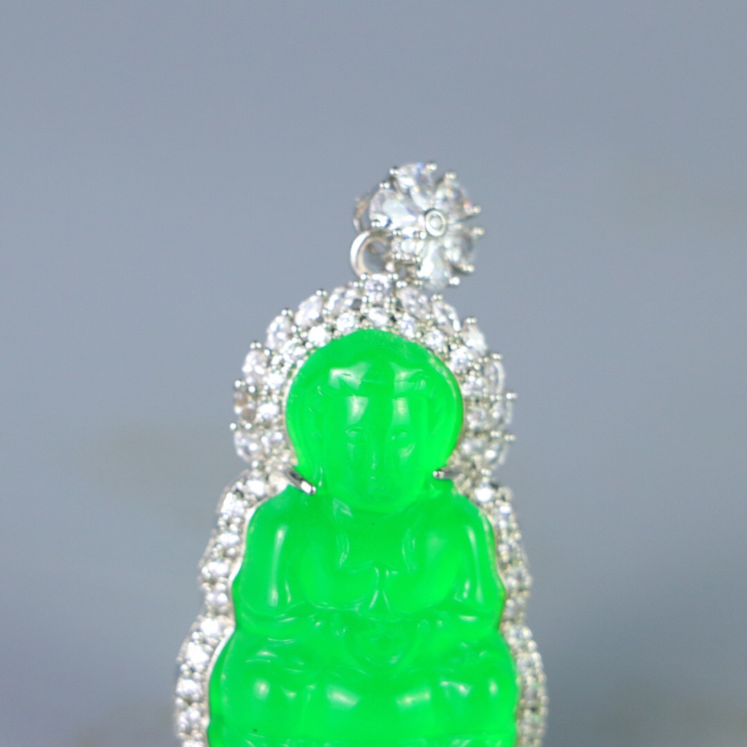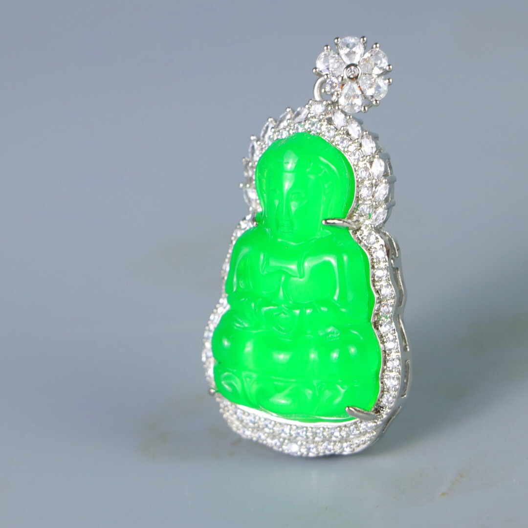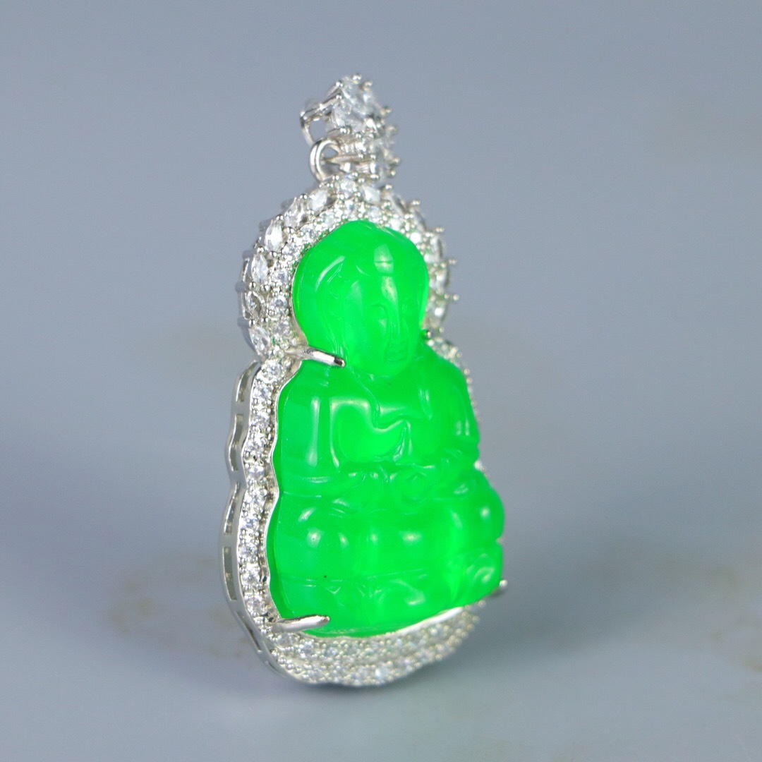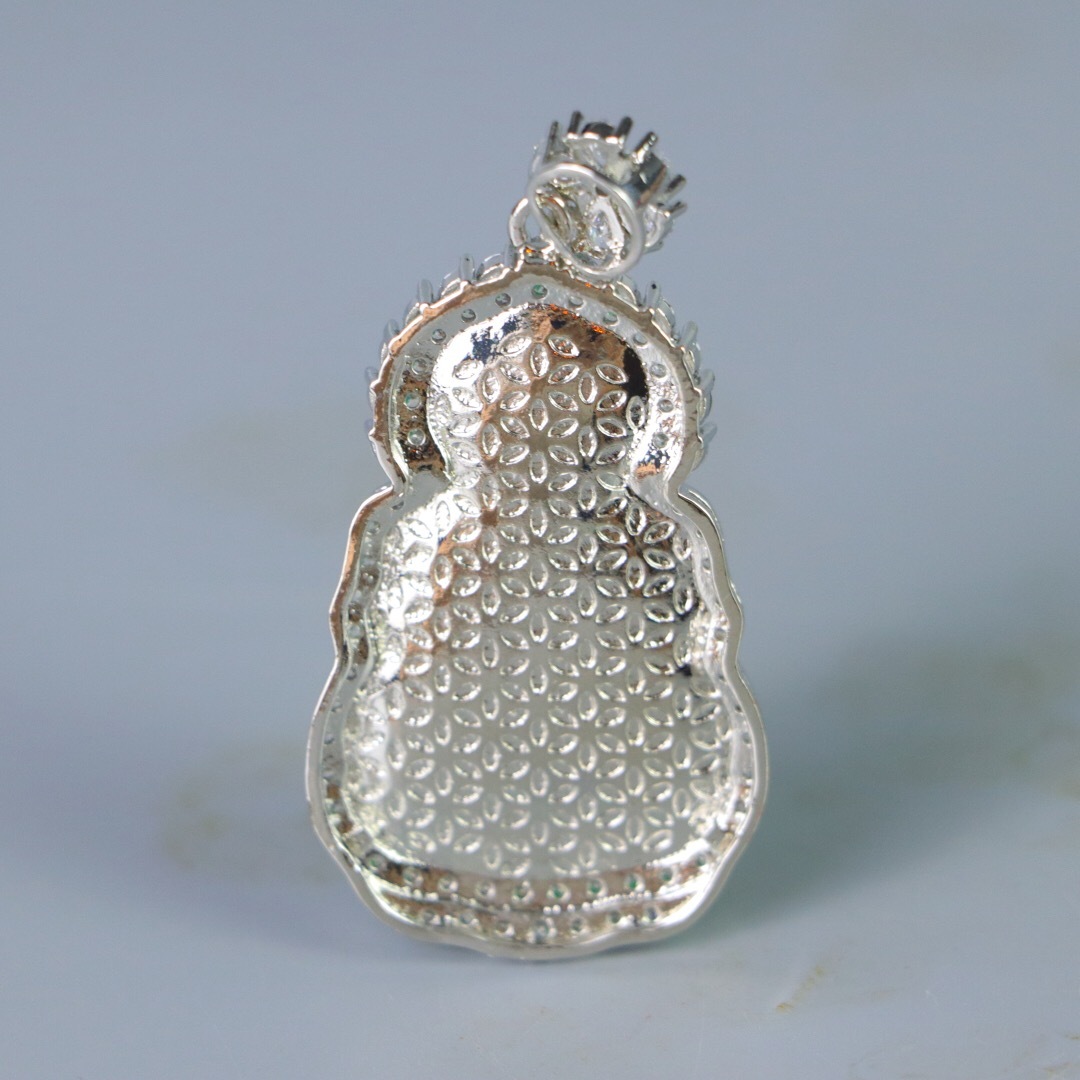 『清・翡翠細密彫・沁色自然・銀嵌・觀音ペンダント・根付・裝身具』極細工 置物 古賞物 中国古玩 中国古美術