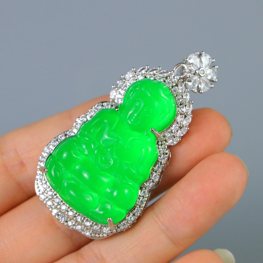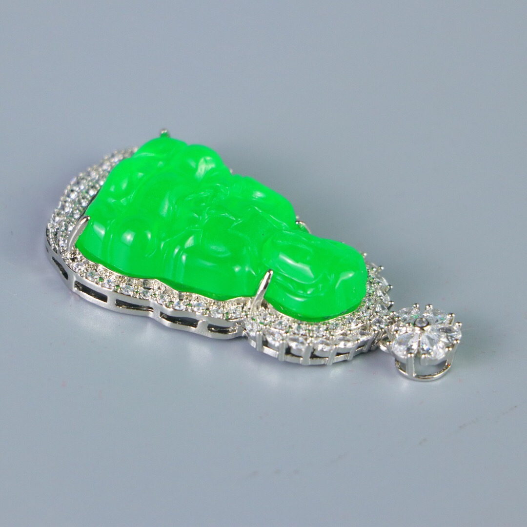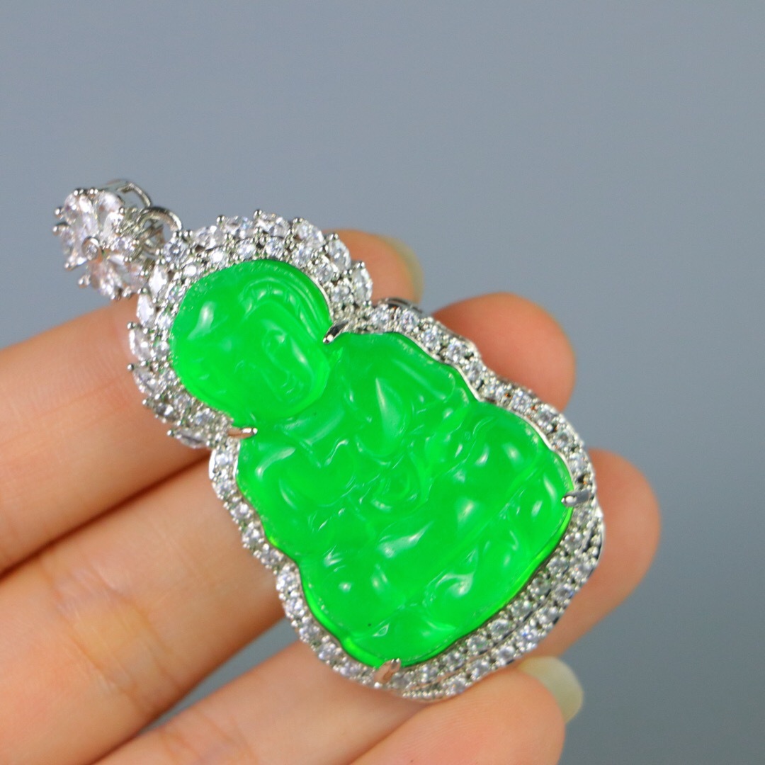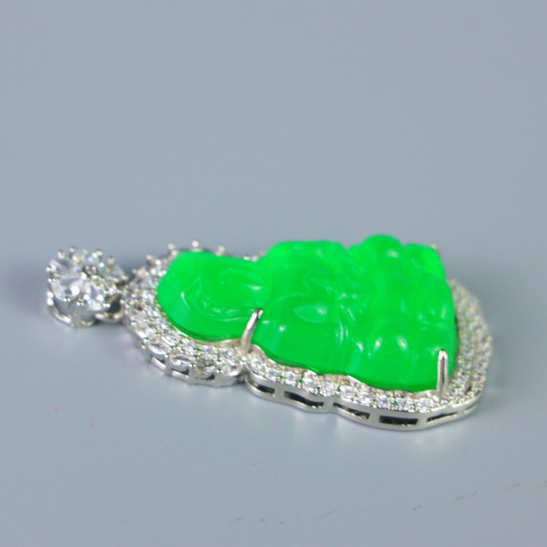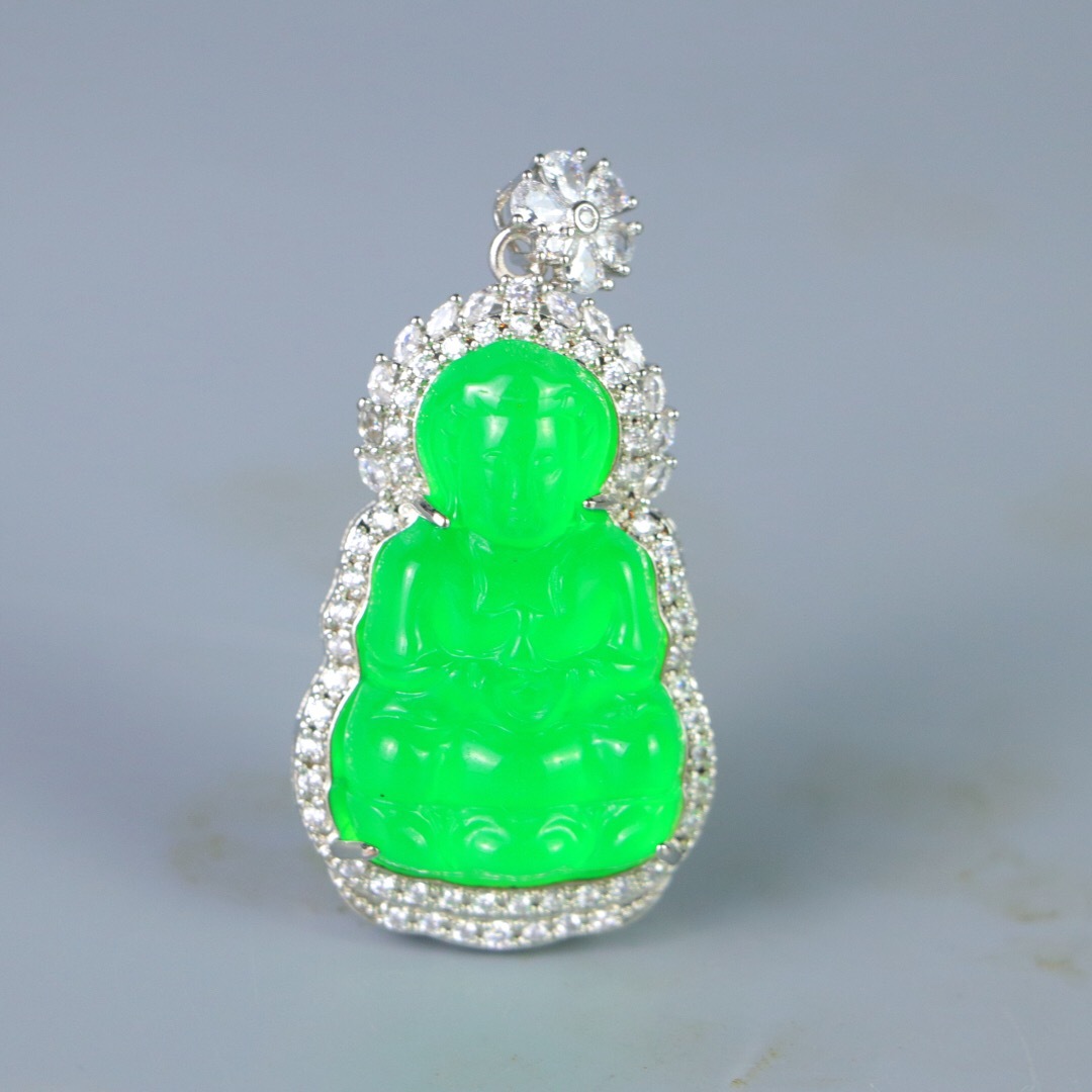 『清・翡翠細密彫・沁色自然・銀嵌・觀音ペンダント・根付・裝身具』極細工 置物 古賞物 中国古玩 中国古美術