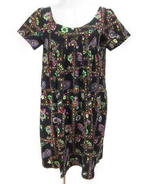 | コメント | しっかり目コットン生地の華やかなワンピース。 黒地に鮮やかなお色使いで個性を発揮できる デザインです。 エンパイアデザインでゆったりとしたライン。 ワンピースとしてもチュニックとしても活躍してくれます。  |