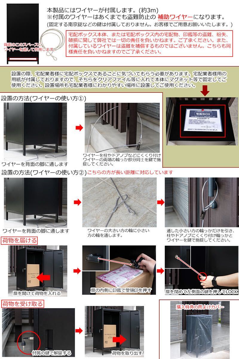 商品説明 | DELIO 宅配ボックス大容量 ハイタイプです ネット通販などの配達物を不在時でも受け取れる、大容量127Lの宅配ボックスです 本体は丈夫なスチール製 盗難防止ワイヤーと鍵付き扉で収納物をしっかり守ります 内部には印鑑収納スペースもあります 配達業者向けの案内用紙も付属し使いやすい仕様になっています クリアファイル等をご用意いただき、マグネット等で宅配業者様にわかりやすい場所に固定してご使用ください(※クリアファイルやマグネットは付属していません) ボックスと柱などを繋ぎ、盗難を防ぐ盗難防止ワイヤーが付属します(約3m) (※固定に使う南京錠は付属していません) ボックス用ビニールカバーが付属します ◆使用上の注意点◆ 10枚目画像必ずご確認お願い致します ブラック(BK)、ブラウン(BR)、グリーン(GN)、ホワイト(WH)の4色展開です 幅520(鍵含む)×奥行400×高さ955mm(梱包サイズ:幅990×奥行490×高さ125mm) 本体重量:13.2kg(梱包重量:15.0kg) 組立式(約30分/プラスドライバーをご用意ください)1個口 スチール(エポキシ粉体塗装) 鍵2個(スペアキー含む) 盗難防止用ワイヤー(ワイヤーを固定する鍵は付いていません) |