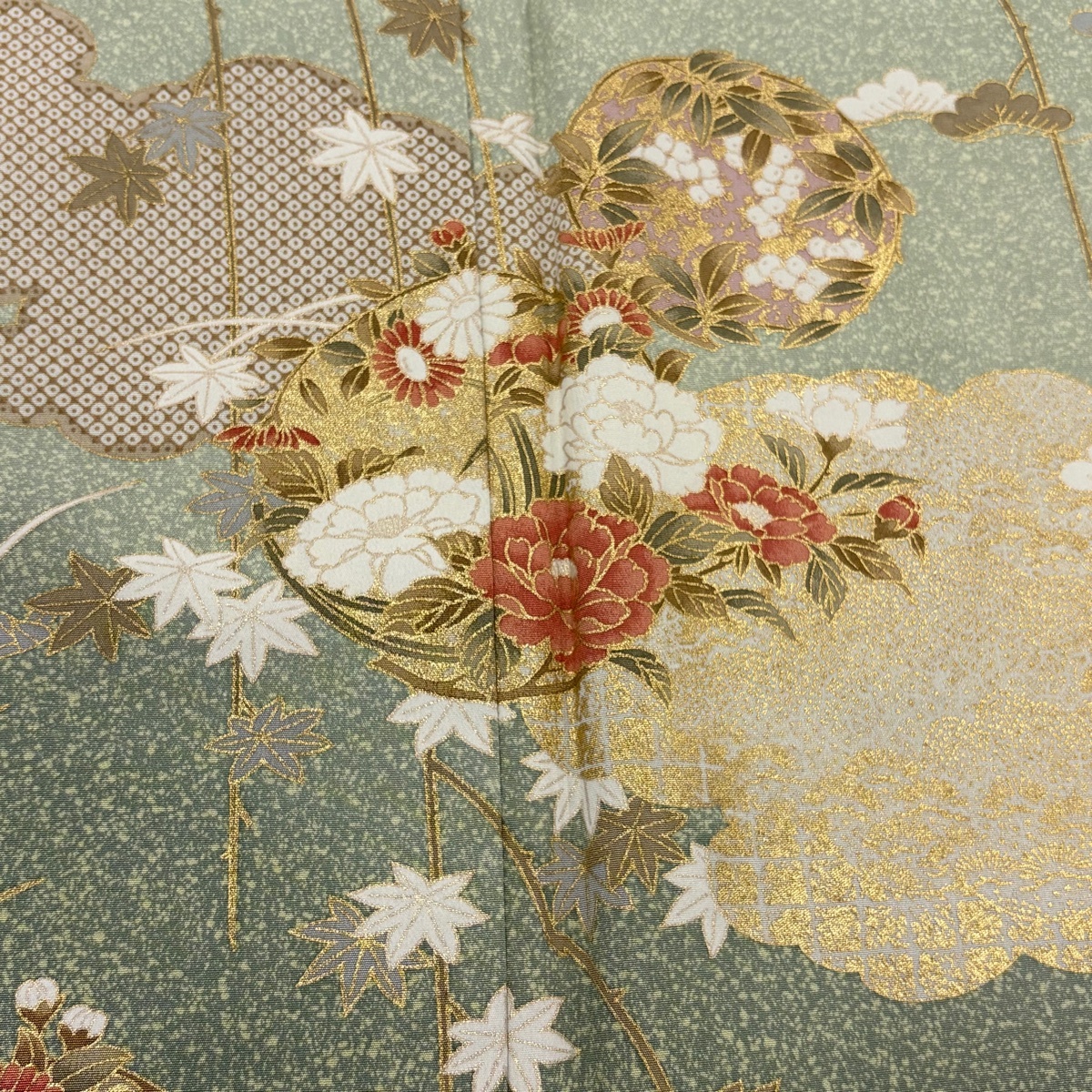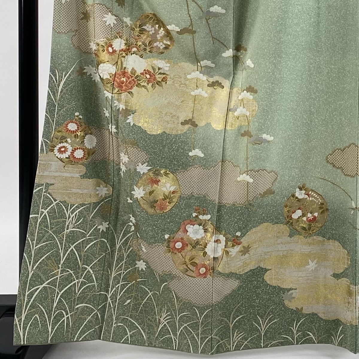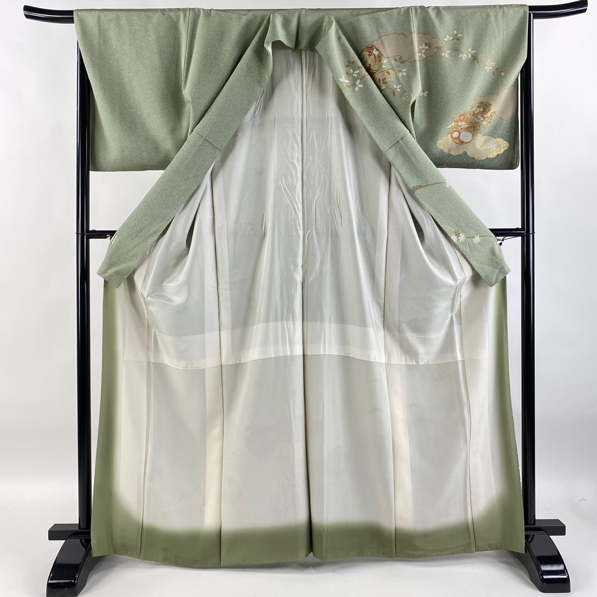 | 訪問着 秀品 花丸文 雲文 金彩 ぼかし 薄緑 袷 身丈165.5 裄丈66.5 M 正絹 【中古】 |