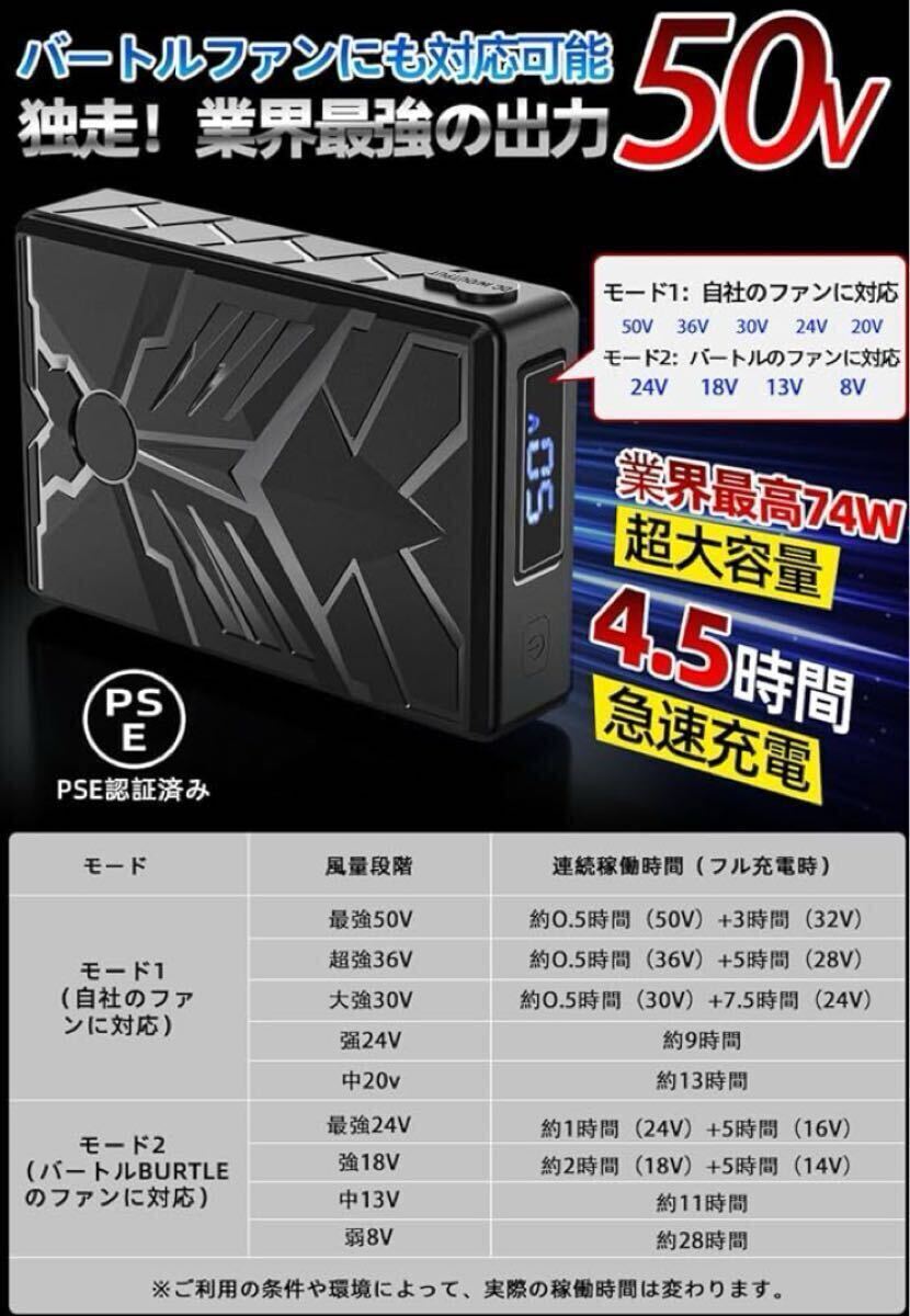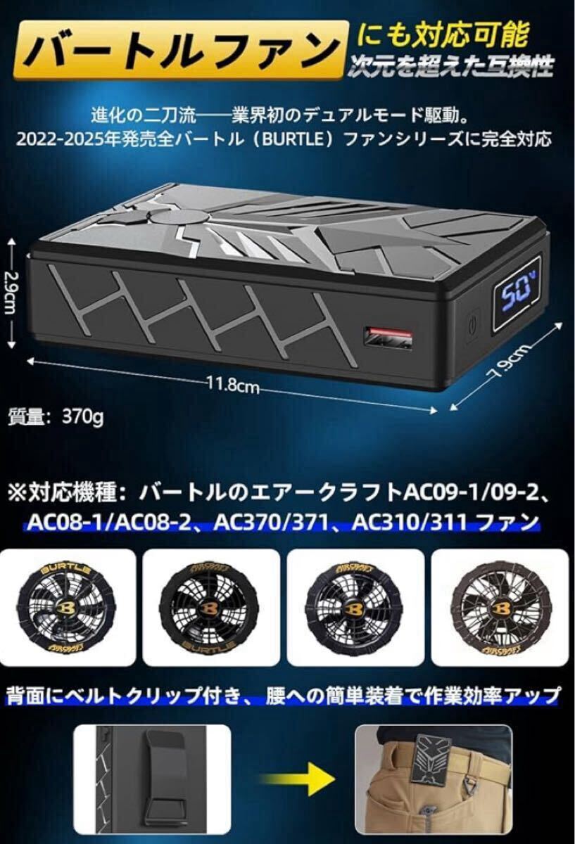 空調作業服用バッテリーの新基準となる8V~50V幅広電圧出力を実現。マルチモード切替機能搭載で、ハイパワーモード時3.5時間~省電力モード時28時間の広域駆動を実現でき、の広域駆動を実現でき、建設現場の過酷な環境からレジャー利用まで、シーンに応じた最適冷却を提供します。着脱式クリップがあり、ベルトや安全帯に取り付けて使用可能です。約4時間の急速充電機能により作業効率を最大化し、コンパクトボディで装着負担を軽減した次世代バッテリーです。【業界最高峰の21700型電池性能】厳選された新エネルギー車専用21700型電池を採用!放電効率は他社比30%アップ、安全性は業界平均を50%凌駕、耐久性は同類製品より35%優越!