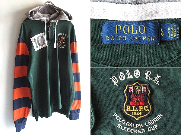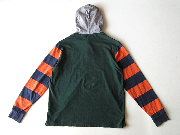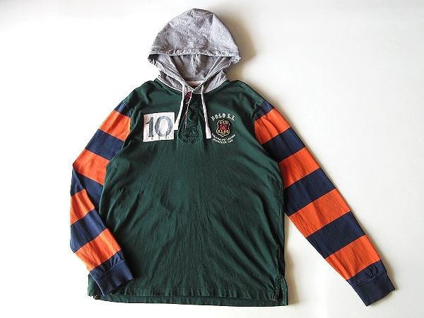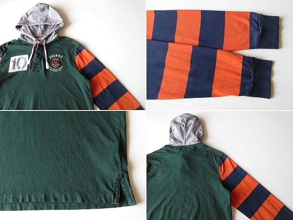 POLO RALPH LAUREN ラルフローレン ロゴ刺繍 ワッペン ボーダー切替 コットン天竺 フード カットソー ラガーシャツ パーカー L グリーン