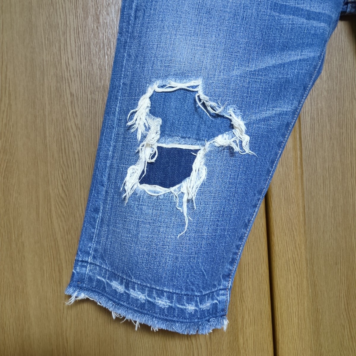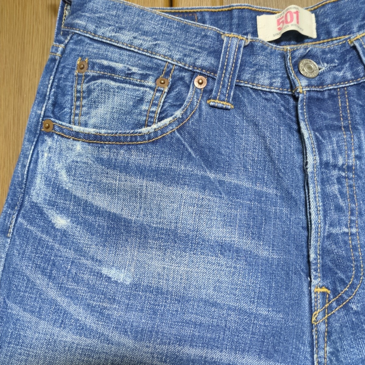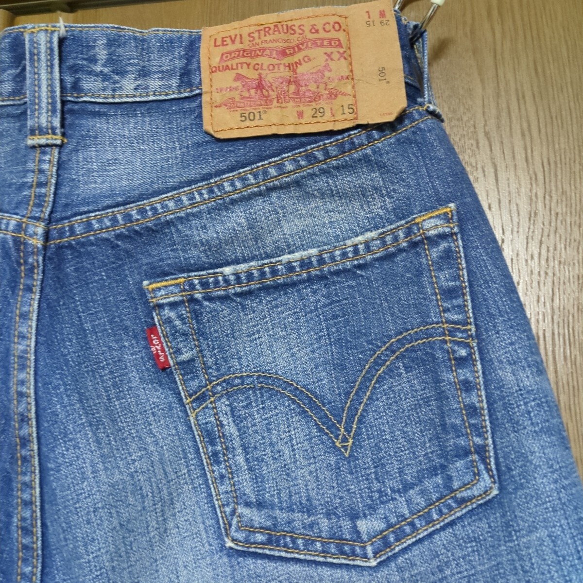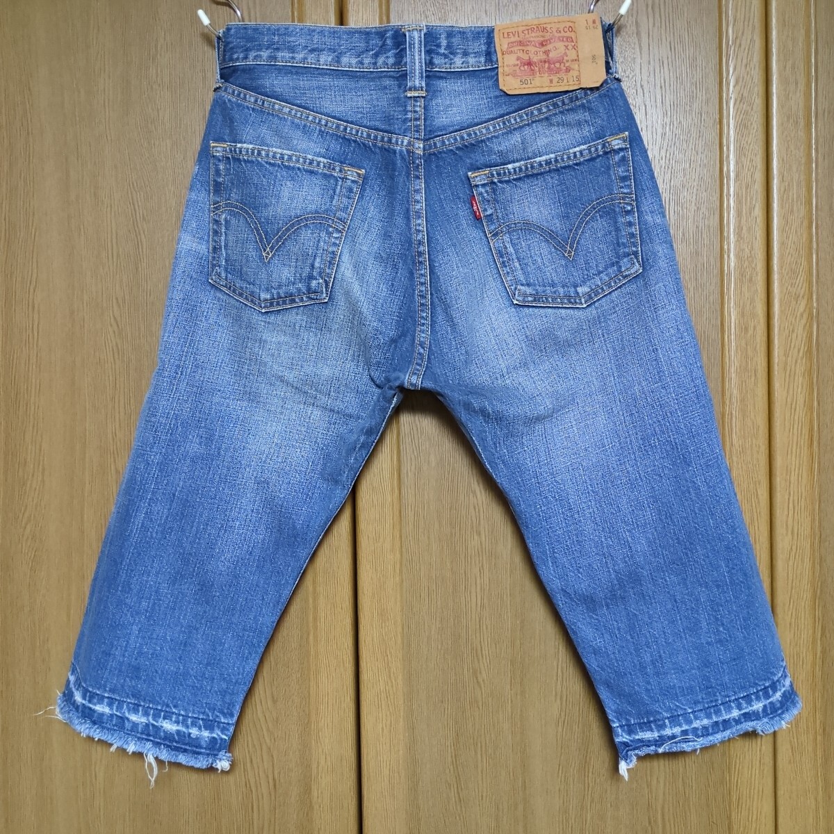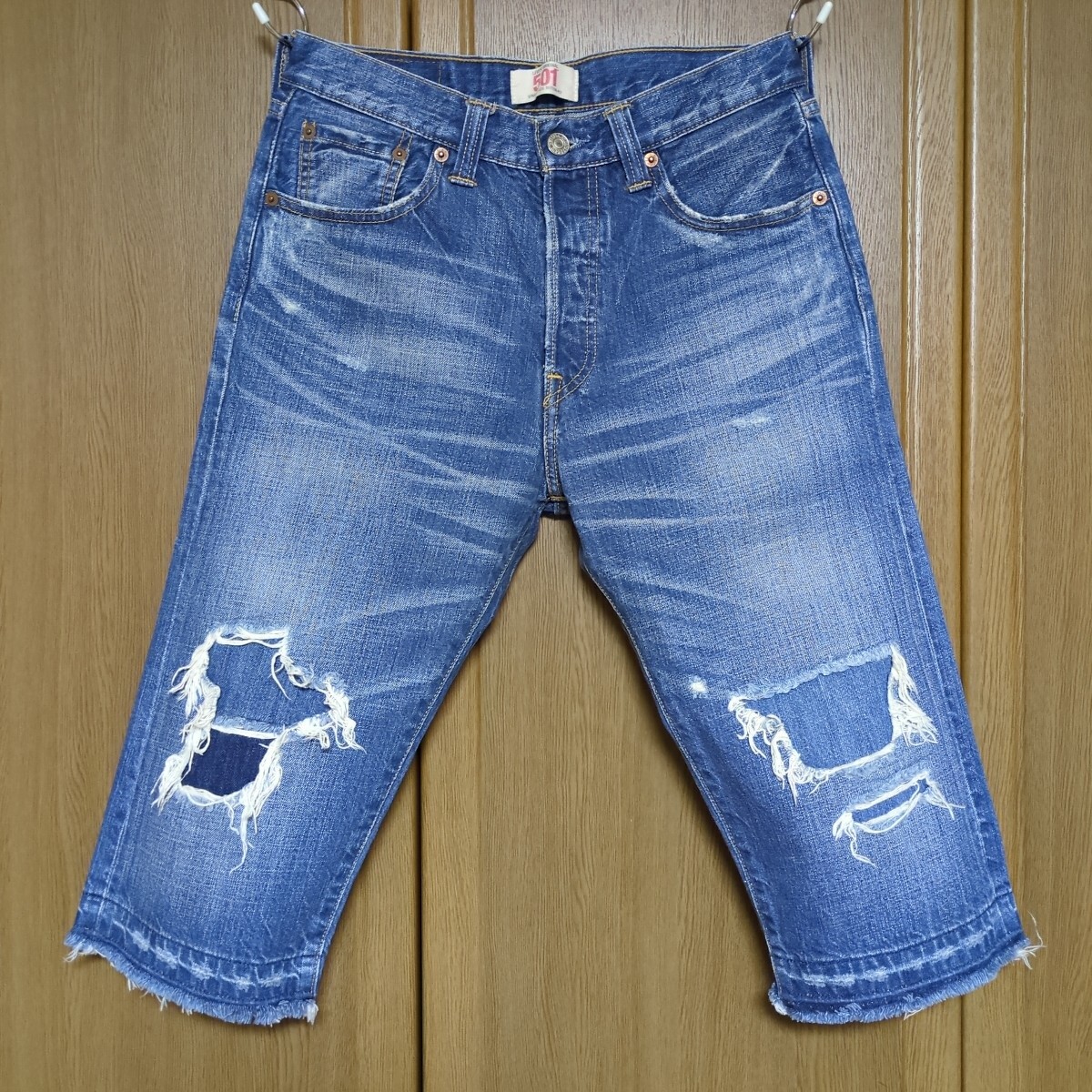 リーバイス501のデニムのショートパンツです。USED加工、クラッシュ加工でいい味出ております。ボタンフライです。若干の使用感ございますが、特に大きなダメージも無く(元からのUSED加工、ダメージ加工はございます)、まだまだ着用して頂けるかと思います。あくまでもUSED品になりますので、神経質な方、古着、USED加工物のご理解のない方、入札お断りです。サイズは、メーカー表記W29L15で、平置き採寸で、ウエスト37,5センチ、前股上27センチ、股下40,5センチ、太ももあたり23、5センチ、裾幅19,5センチ、総丈65,5センチ(サイドで計測)です。素人採寸ですので多少の誤差はお許しください。