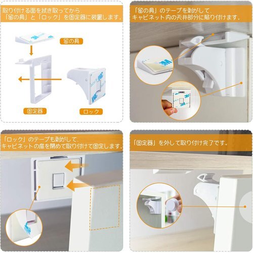 【強力両面テープ+環境保護ABS材質】優れた両面粘着テープと環境に優しいABS素材で作られたチャイルドロックは、粘着力が強くて、しっかり貼り付けられます。不要の時、綺麗に剥がせ、テープ跡を残る心配がない!環境にやさしい素材は家族に損害なしご安心ください。