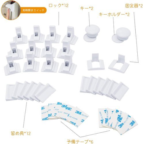 【幅広い対応性とセット内容】セット内容:ロック*12、留め具*12、キー*2、キーホルダー*2、固定器*2(固定器は12個のロックのうち2個に取り付けられています)、予備テープ*6。家の中にある大抵のキャビネット、食器戸棚、引き出し、タンスなどに対応可能です。ご注意:接着力を高めるため、取り付け後は24時間ほど放置してから使用してください。