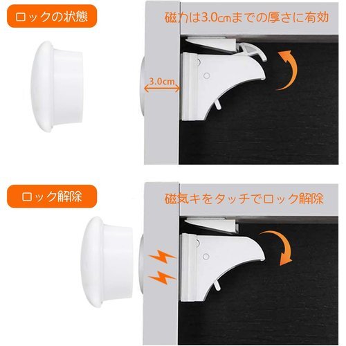 【マグネット式で施錠、解除が簡単】磁石キを引き出しや扉の外側に近づけると、磁力でロック部が下がり、ロックが解除されます。扉を閉めてマグネットキーを離すと、自動でロックが掛かります。コツがいらないので、簡単に開閉可能です。※マグネットキーの磁力は厚さ3cmまでの扉に対応。