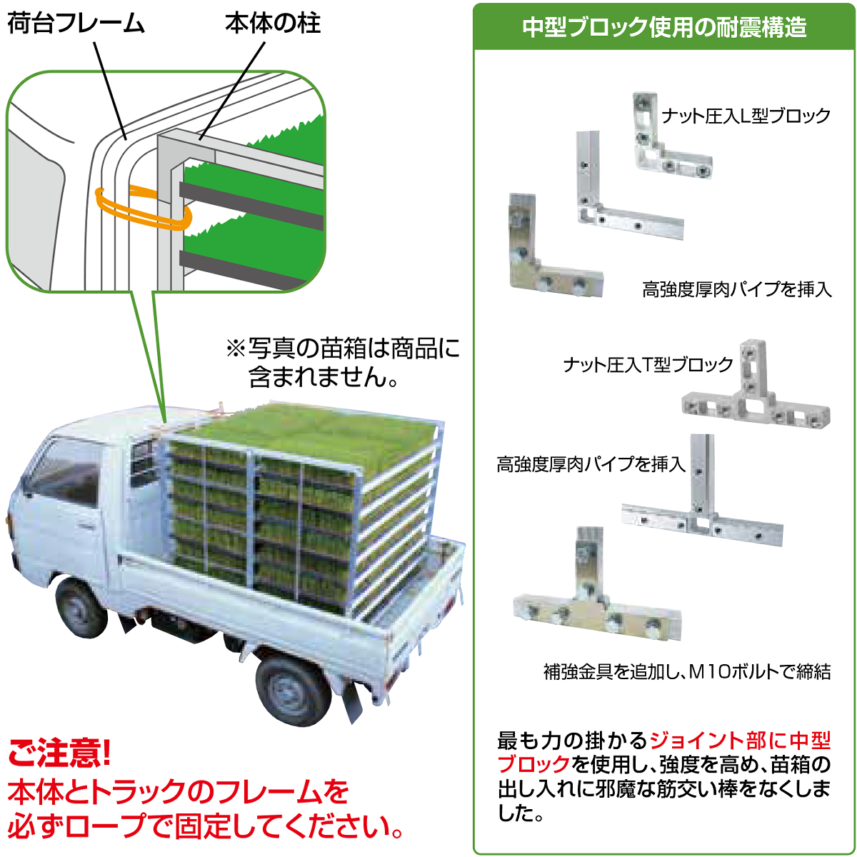 多量の苗でも移動・保管がラクにできる収納棚!! NS-96 水平収納 収納枚数96 質量42.1kg 4棚×3列×8段 棚間隔130mm×全長1965mm×全幅1280mm×全高1200mm | ||