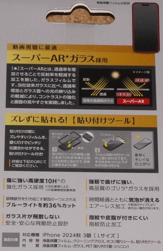 ELECOM iPhone16Pro Max ガラスフィルム ゴリラガラス 0.21mm ブルーライトカット 高透明 新品・未開封です。