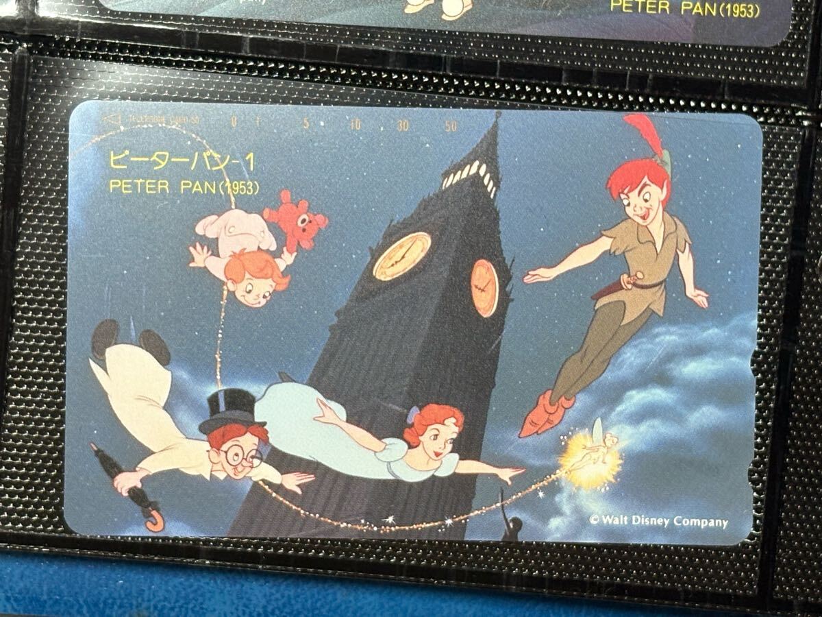 ディズニー映画『ピーターパン(1953年)』の名場面、ピーターパンがウェンディたちと共にロンドンの夜空を飛ぶシーンが描かれたテレホンカードです。背景にはビッグベンが美しく描かれ、ファンタジックな世界観が存分に表現されています。シリーズ表記「ピーターパン1」があり、コレクション性も高い一枚です。