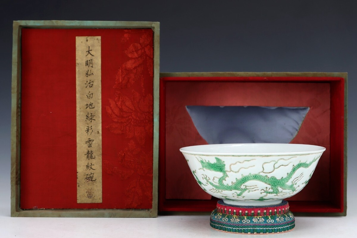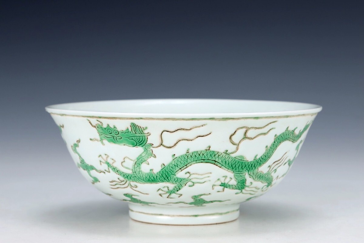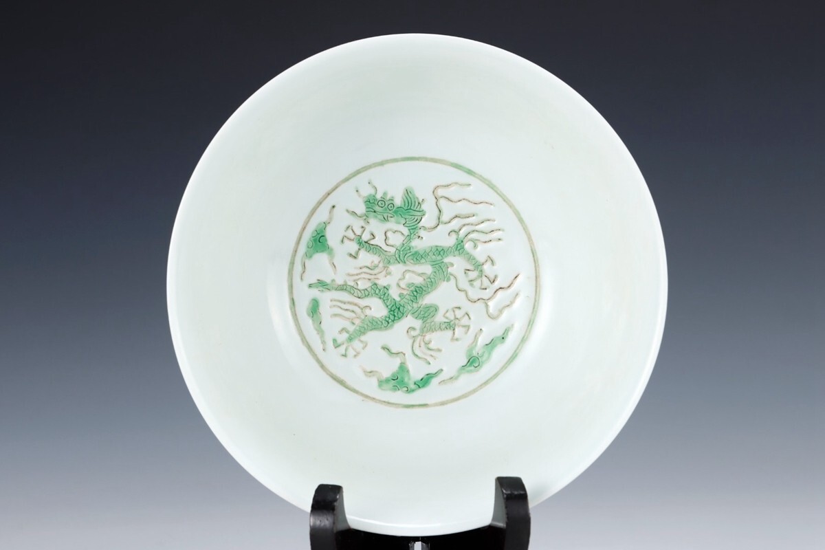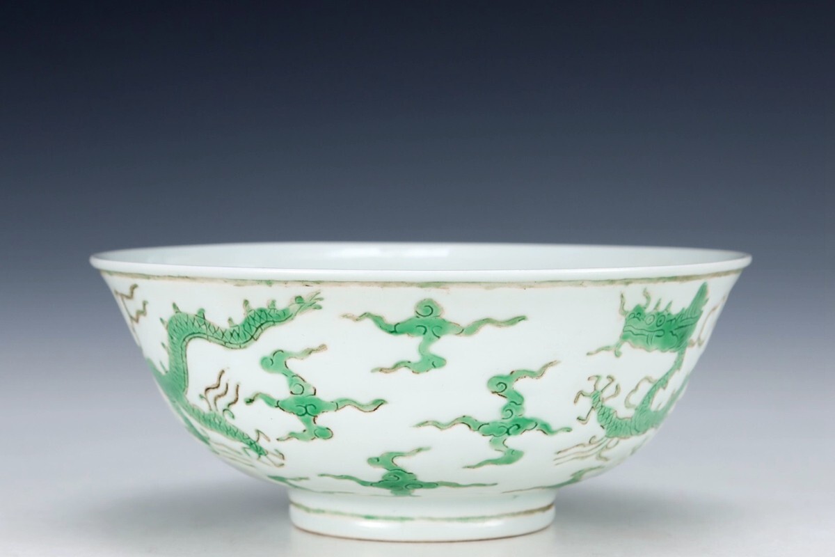 明代 大明弘治年製 陶磁器 白地緑彩雲龍紋碗【仁】染付 置物擺件 古賞物 古美術 中国古玩 蔵出