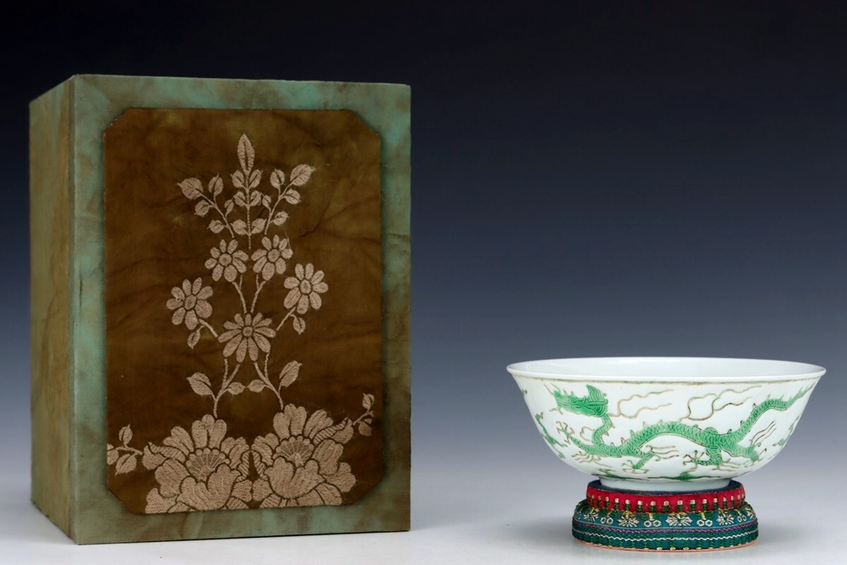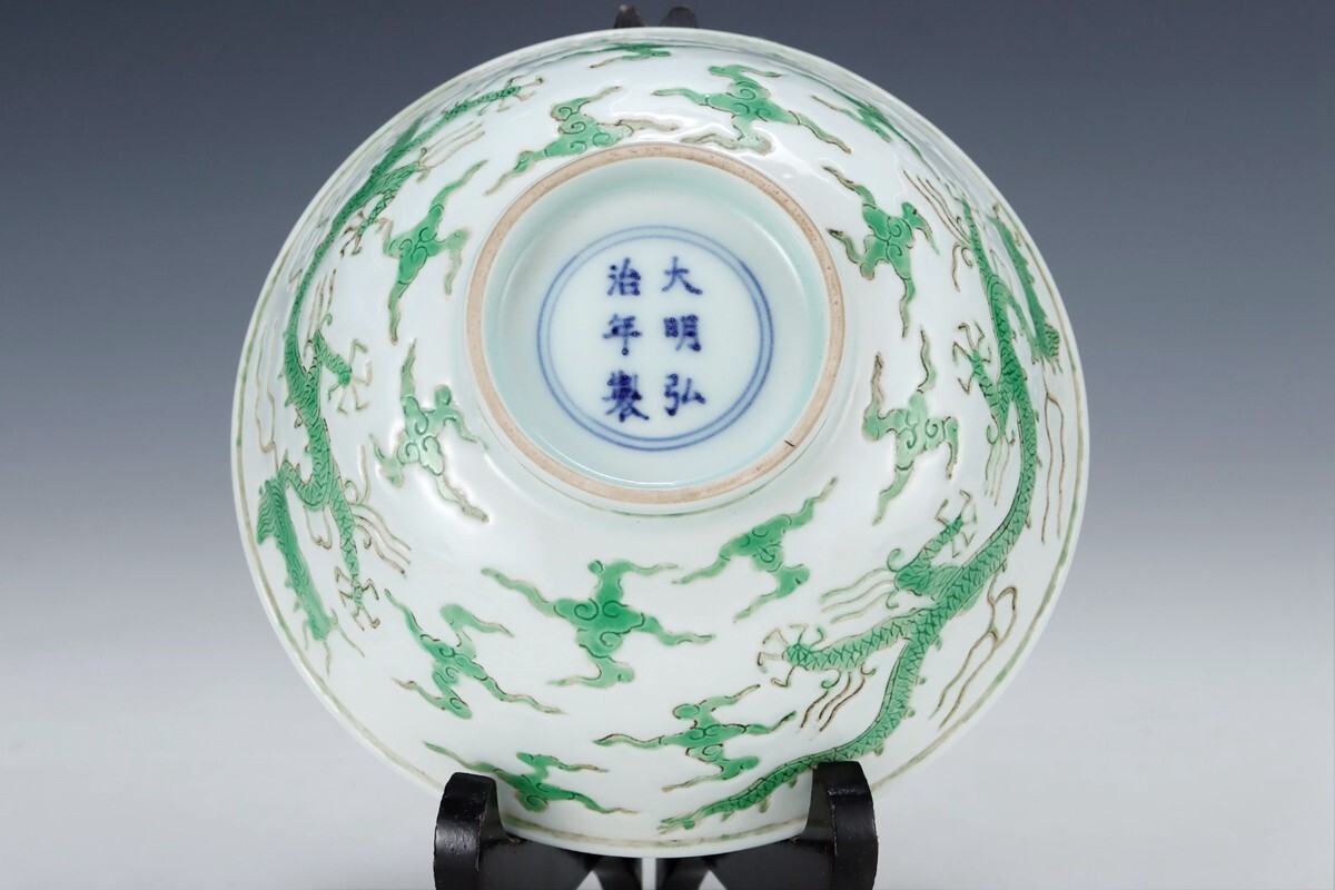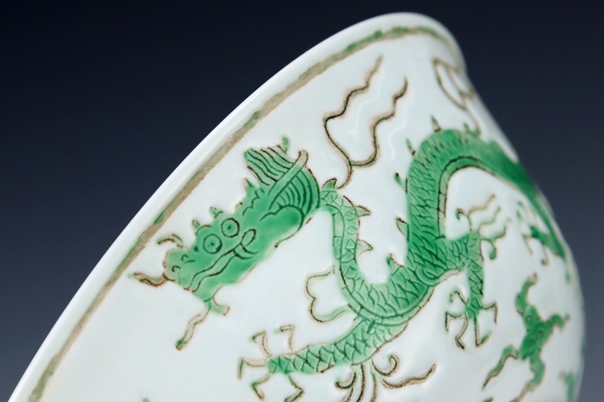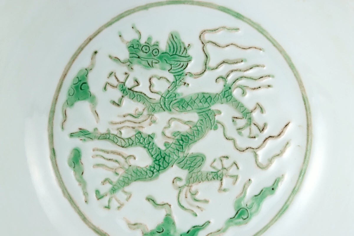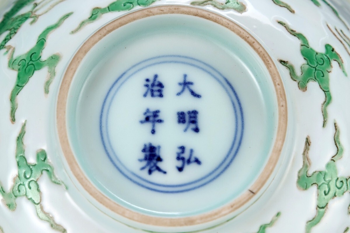 明代 大明弘治年製 陶磁器 白地緑彩雲龍紋碗【仁】染付 置物擺件 古賞物 古美術 中国古玩 蔵出