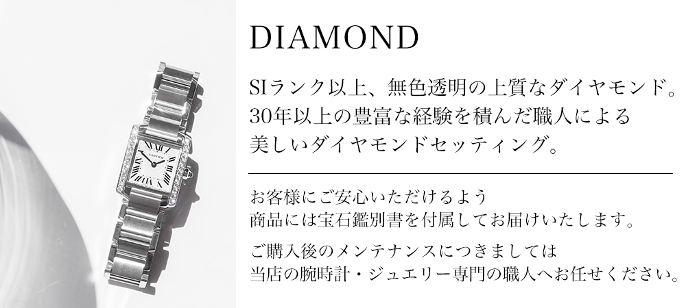 ・こちらはアフターダイヤモンド商品となります。当店の基準をクリアした、クラリティVS,SI以上、カットexcellent,good以上、無色透明で輝きの強いダイヤモンドのみを取り扱い、当店専属工房(国内)にて熟練の職人が丁寧に仕上げております。万が一、ダイヤが取れた場合は永年保証にて再セッティングいたします。アフターサポートも当店にお任せください。