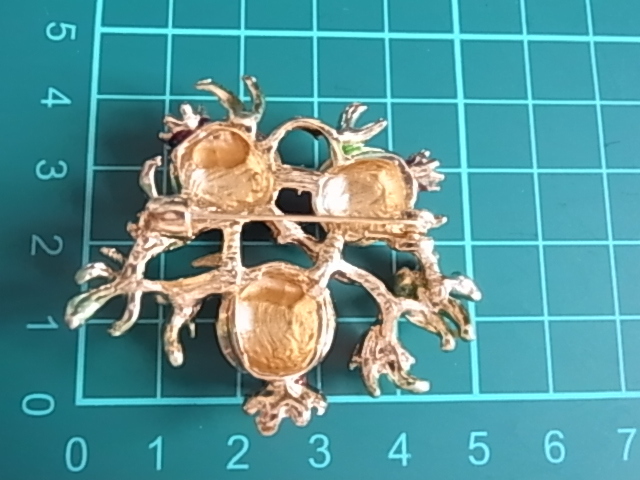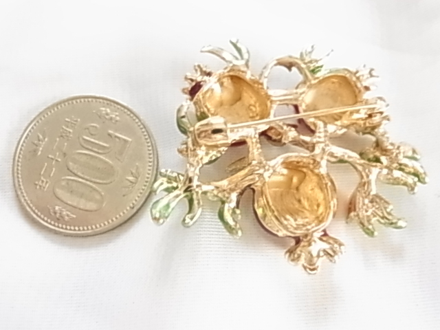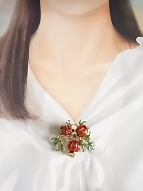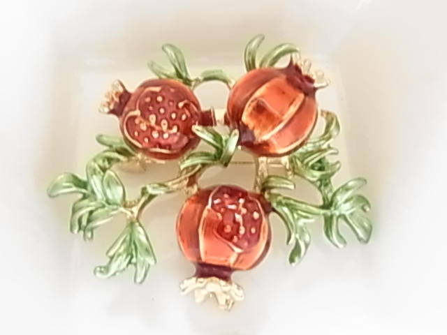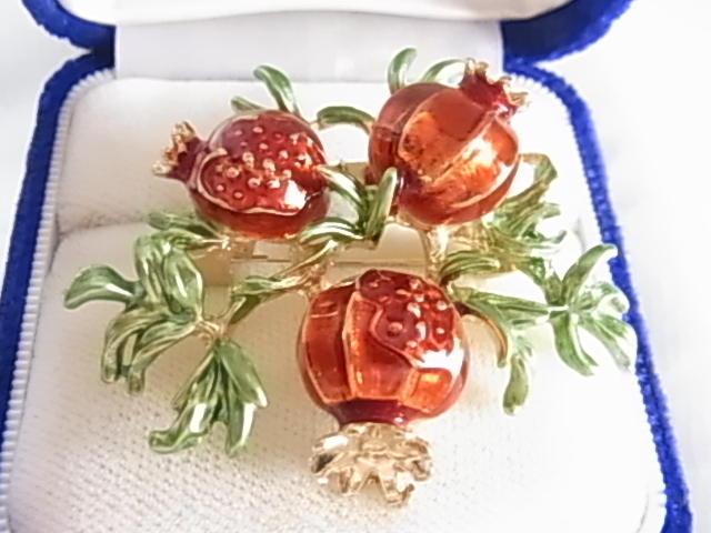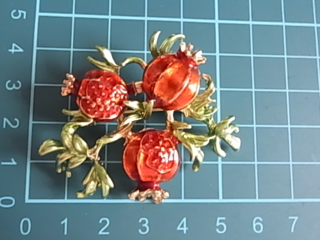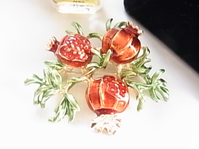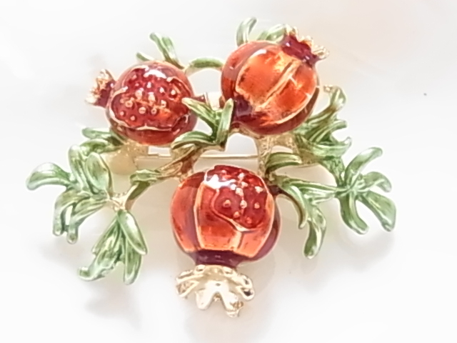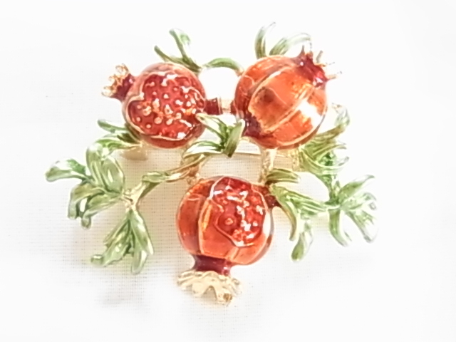 ▲未使用 ザクロモチーフ ざくろ 柘榴 石榴 レッドトーンとグリーントーン 優雅な印象 メタル? 海外製 素敵なブローチ