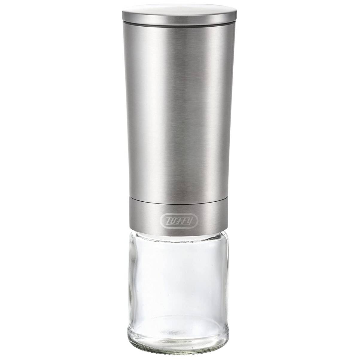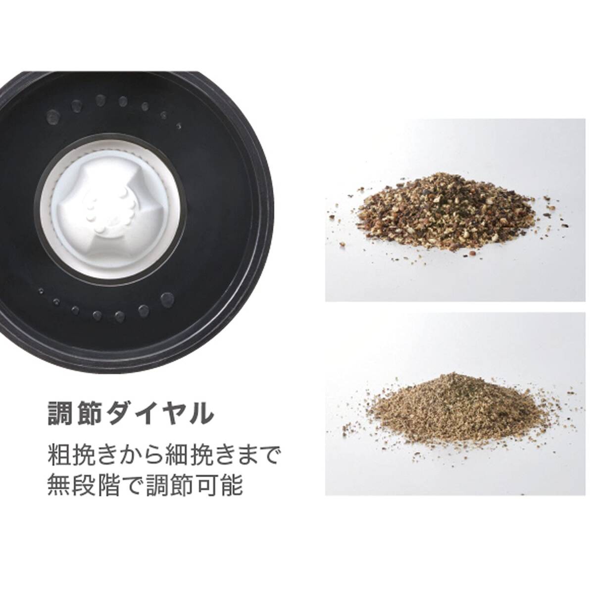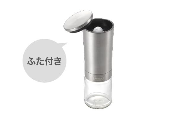 傾けるだけで自動で挽ける 簡単操作の電動ミル。片手でさっと使えて調理にも食卓でも大活躍。片手でさっと使えるため、調理やお食事の際にも使いやすい。コードレスな乾電池式のため、食卓でもアウトドアでも場所を選ばず様々なシーンで使用できます。丈夫なセラミック製の刃は、摩耗しづらくさびにくいほか、摩擦熱が少ないので熱による調味料の香り飛びを防ぎます。お料理に合わせて、粗挽きから細挽きまで無段階で調整が可能です。ボトルは100mlの大容量で、詰め替えやすい広口タイプ。匂いや色が移りにくいガラス製です。 別売りのボトルと合わせて使うと、他の調味料にも簡単に取り換えでき、保存にも便利です。保管時は口が上になるため挽き残りがこぼれにくく、埃も防げるふた付きで安心です。