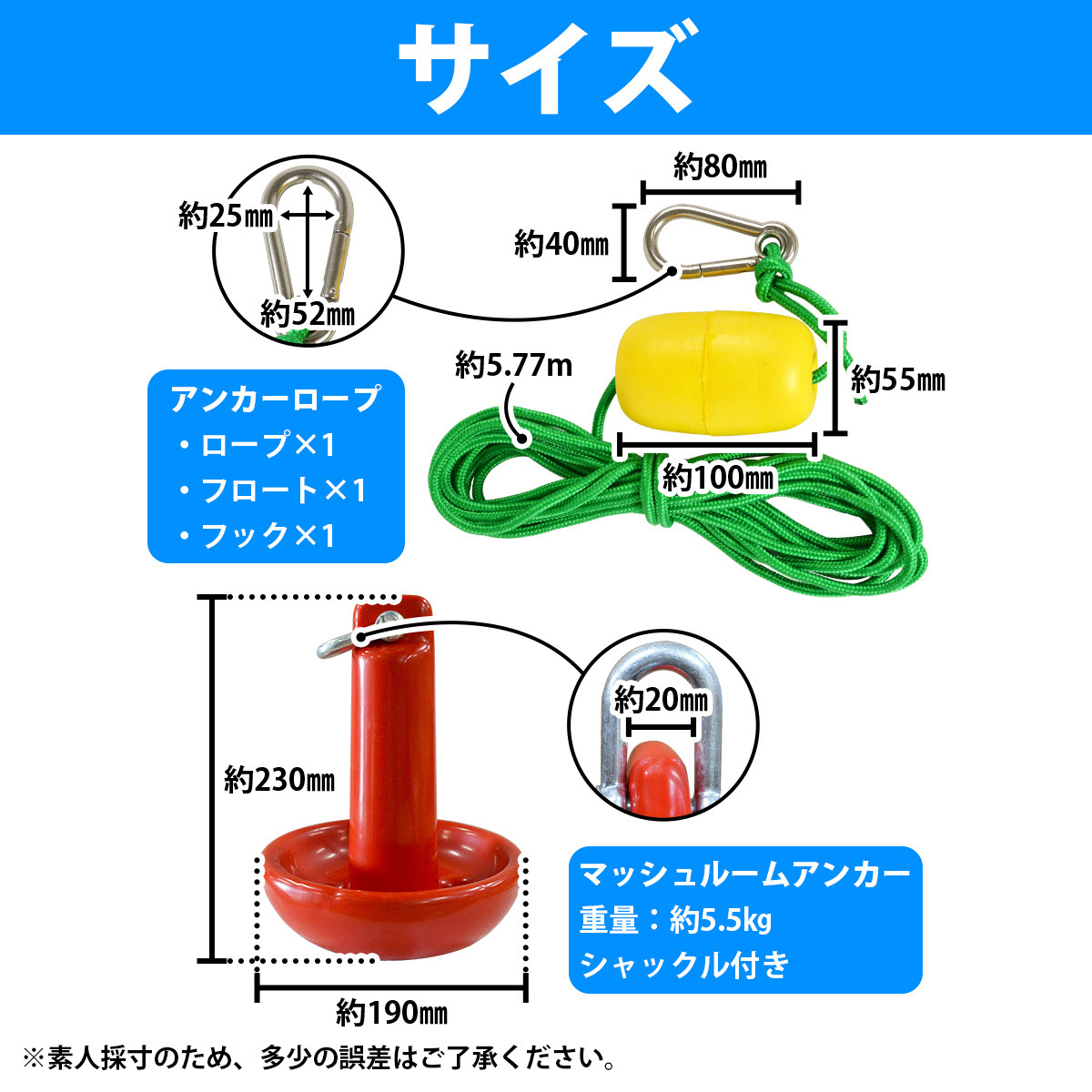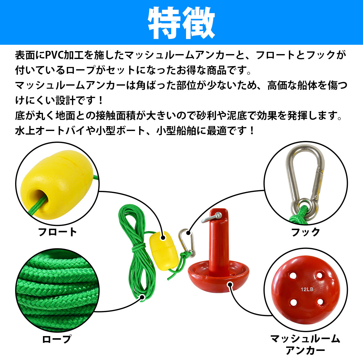 『ロープ アンカー セット』マッシュルームアンカー 12LBS 5.5kg 赤/レッド フロート/ロープ/フック付!ジェットスキー 船